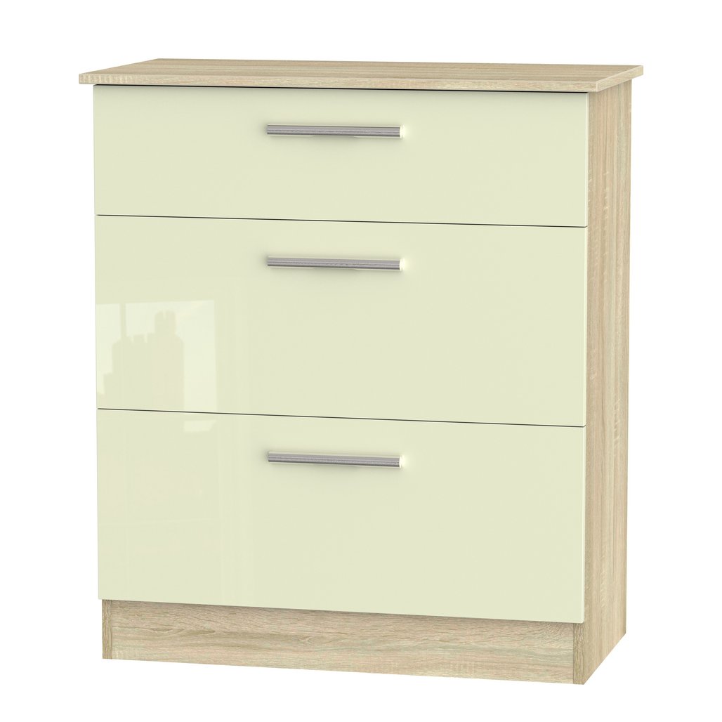 This deep 3 drawer chest of drawers is practical and stylish. Perfect for any home as a free standing storage unit. Create your dream bedroom with our exclusive Contrast range. This range enhances the beauty of any bedroom style. This range is made up of high-quality materials & long-lasting finishes. The fronts are complemented by sleek designer-style metal handles and when you open the drawers, you'll notice the smooth metal runners and linen-look interior. All our furniture is made in the United Kingdom, to the highest quality. It is delivered direct to your location of choice by one of our two man delivery teams, and comes fully assembled (although legs may be removed to prevent damage in transit).