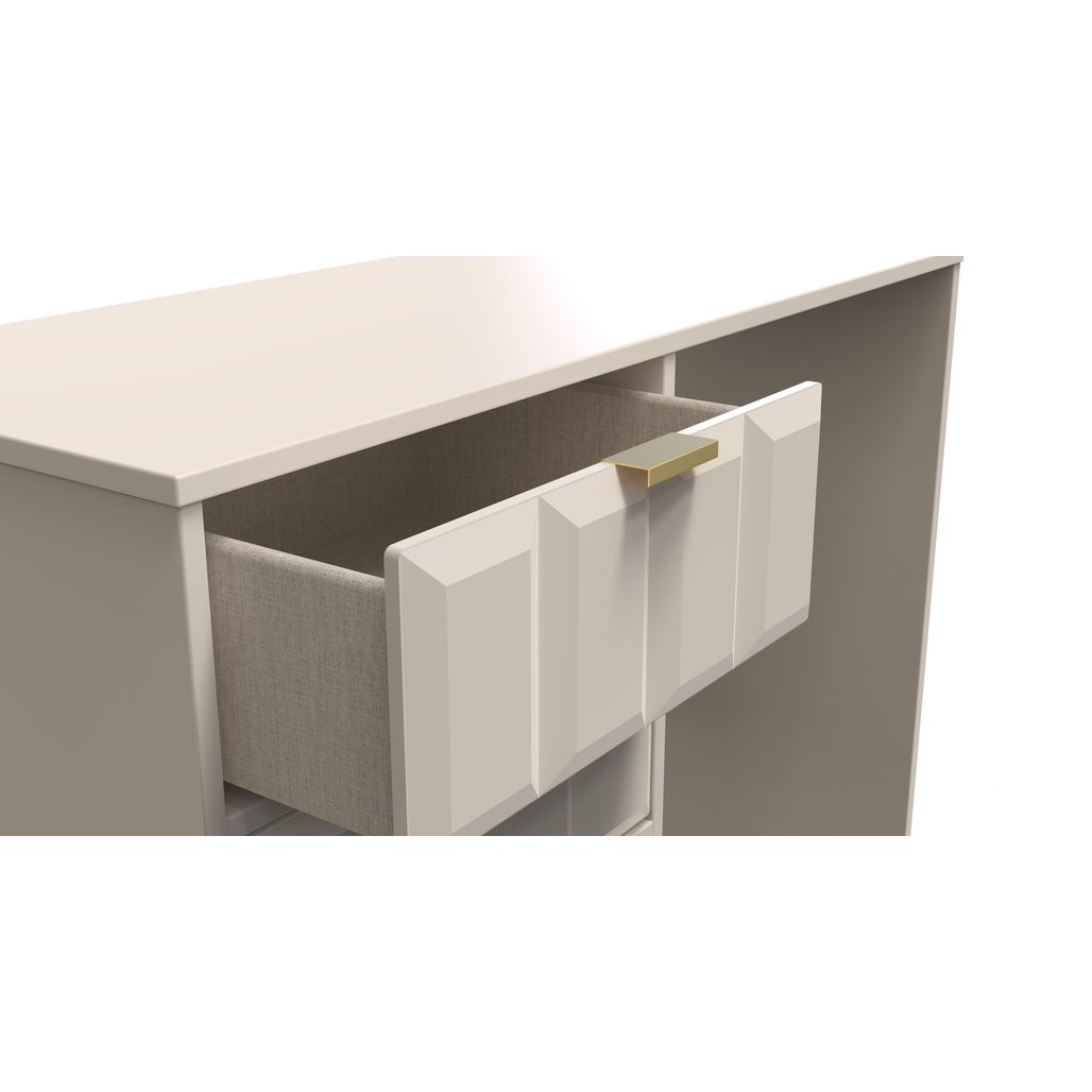 This 4 Drawer Vanity/Desk is equally at home in the bedroom or the office. A modern and distinctive range. Named for the unique "Cube" patten of the drawer and door fronts. Also features Gold Metal Handles and Gold Hairpin Legs. Comes in a wide range of colours including eye cathching two tone colour combinations. All our furniture is made in the United Kingdom, to the highest quality. It is delivered direct to your location of choice by one of our two man delivery teams, and comes fully assembled (although legs may be removed to prevent damage in transit).