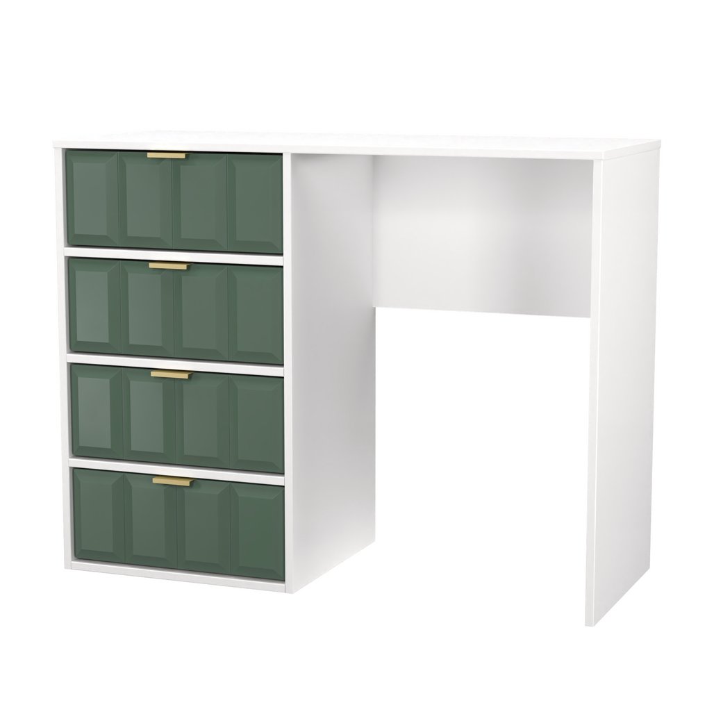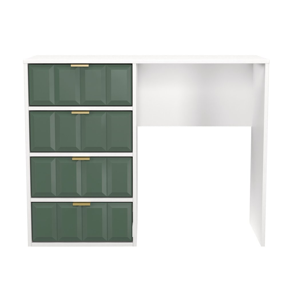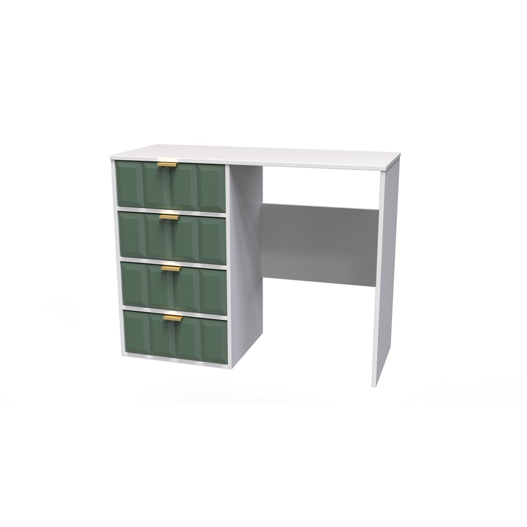 This 4 Drawer Vanity/Desk is equally at home in the bedroom or the office. A modern and distinctive range. Named for the unique "Cube" patten of the drawer and door fronts. Also features Gold Metal Handles and Gold Hairpin Legs. Comes in a wide range of colours including eye cathching two tone colour combinations. All our furniture is made in the United Kingdom, to the highest quality. It is delivered direct to your location of choice by one of our two man delivery teams, and comes fully assembled (although legs may be removed to prevent damage in transit).