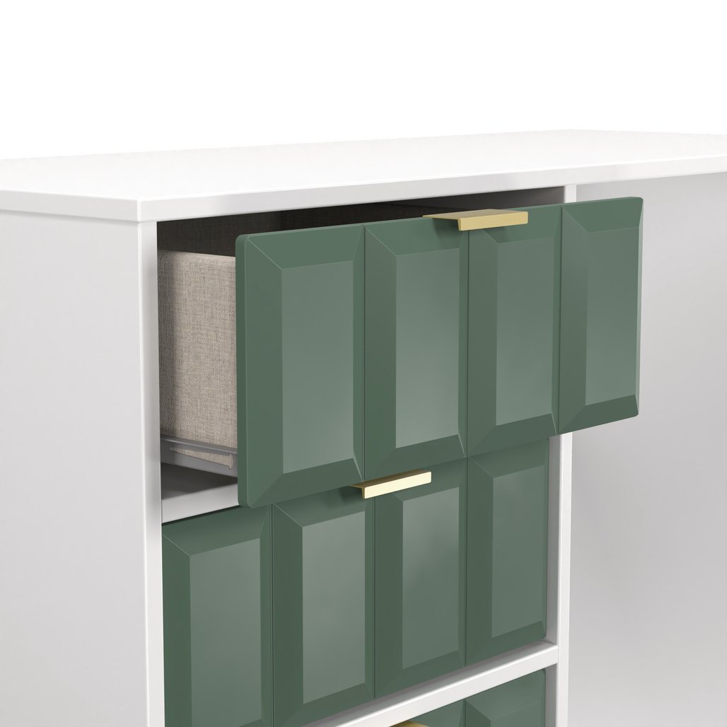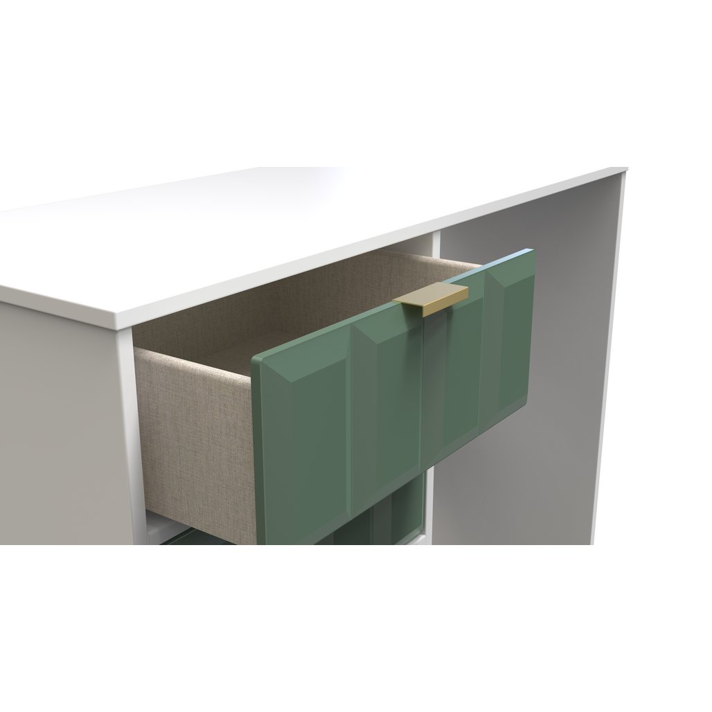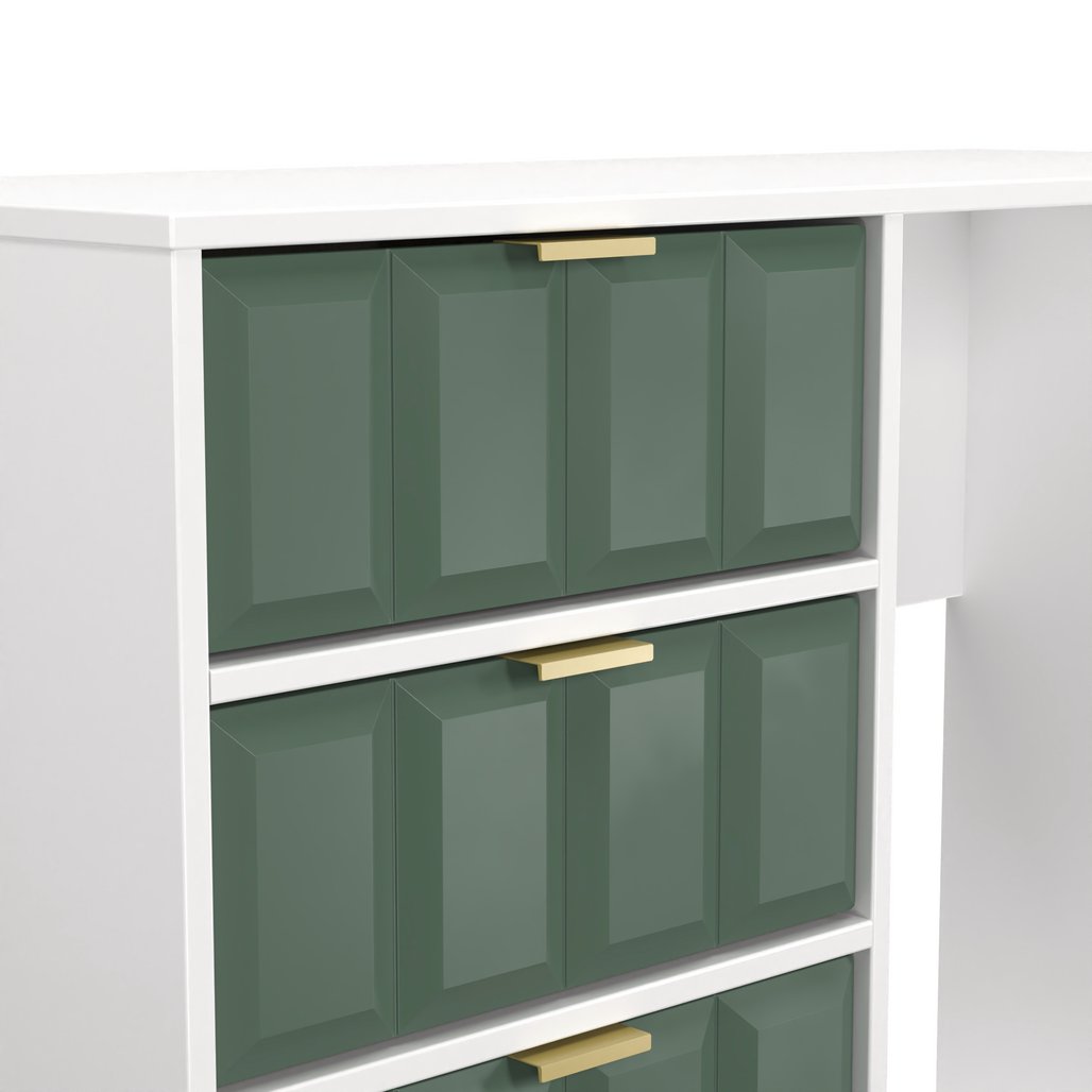 This 4 Drawer Vanity/Desk is equally at home in the bedroom or the office. A modern and distinctive range. Named for the unique "Cube" patten of the drawer and door fronts. Also features Gold Metal Handles and Gold Hairpin Legs. Comes in a wide range of colours including eye cathching two tone colour combinations. All our furniture is made in the United Kingdom, to the highest quality. It is delivered direct to your location of choice by one of our two man delivery teams, and comes fully assembled (although legs may be removed to prevent damage in transit).