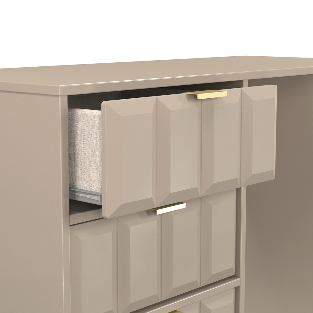 This 4 Drawer Vanity/Desk is equally at home in the bedroom or the office. A modern and distinctive range. Named for the unique "Cube" patten of the drawer and door fronts. Also features Gold Metal Handles and Gold Hairpin Legs. Comes in a wide range of colours including eye cathching two tone colour combinations. All our furniture is made in the United Kingdom, to the highest quality. It is delivered direct to your location of choice by one of our two man delivery teams, and comes fully assembled (although legs may be removed to prevent damage in transit).