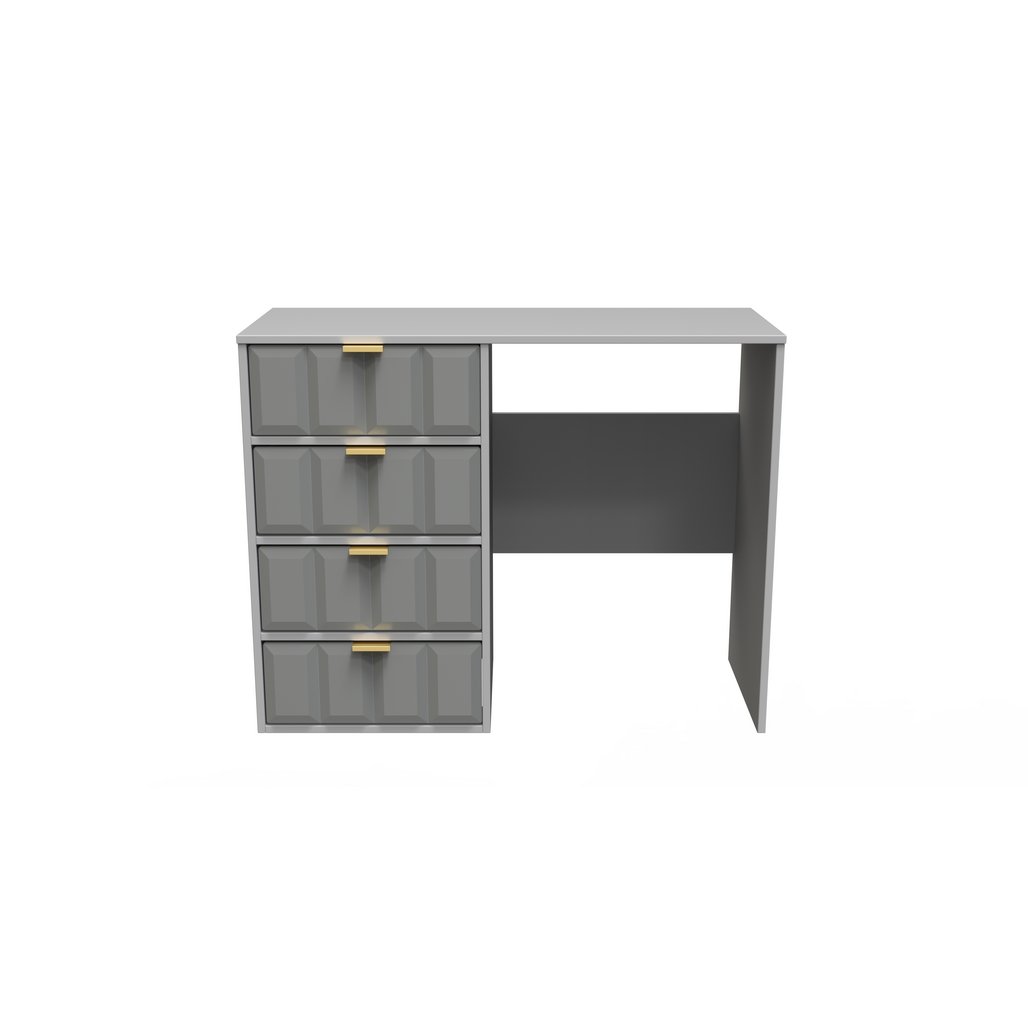 This 4 Drawer Vanity/Desk is equally at home in the bedroom or the office. A modern and distinctive range. Named for the unique "Cube" patten of the drawer and door fronts. Also features Gold Metal Handles and Gold Hairpin Legs. Comes in a wide range of colours including eye cathching two tone colour combinations. All our furniture is made in the United Kingdom, to the highest quality. It is delivered direct to your location of choice by one of our two man delivery teams, and comes fully assembled (although legs may be removed to prevent damage in transit).