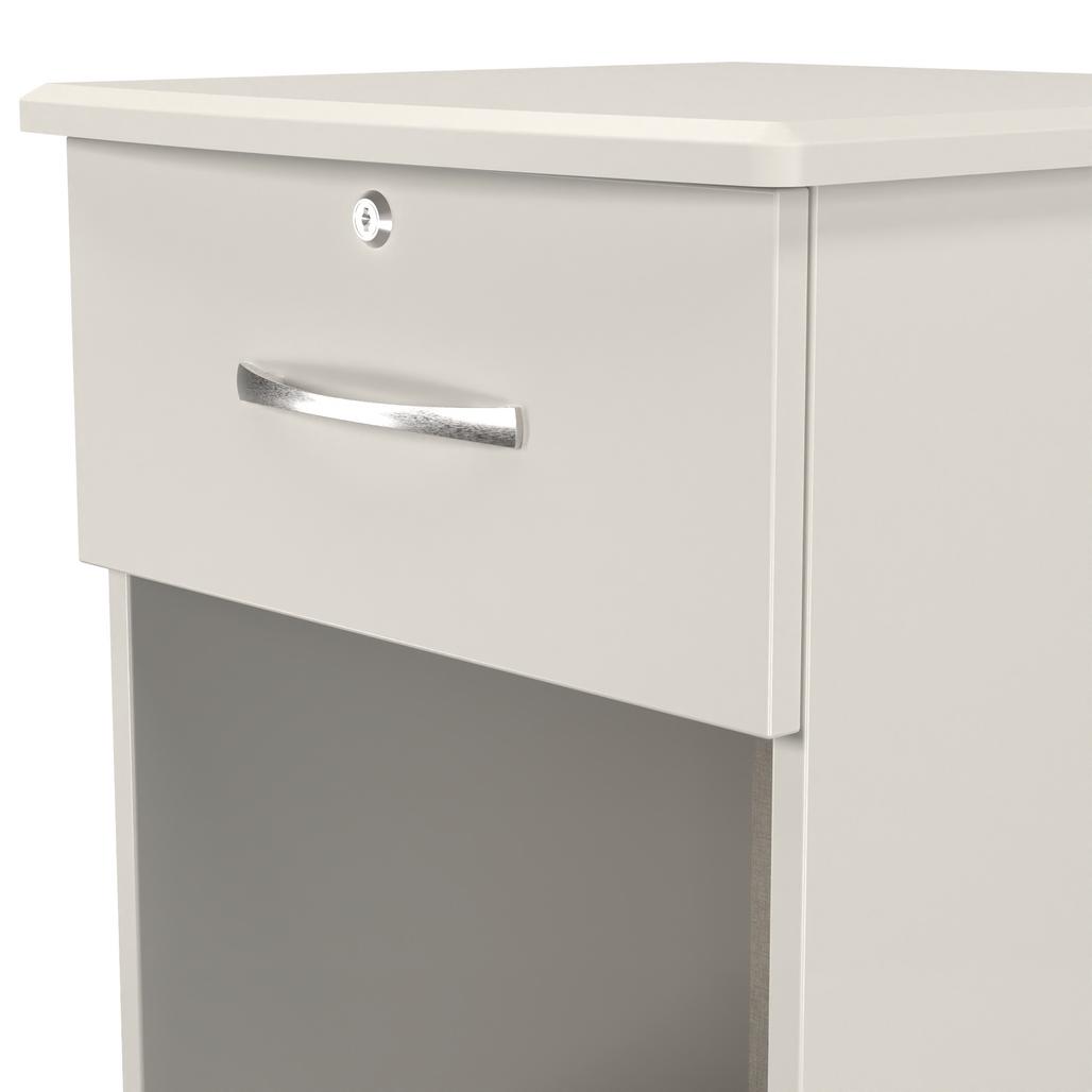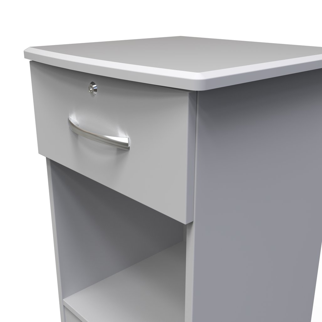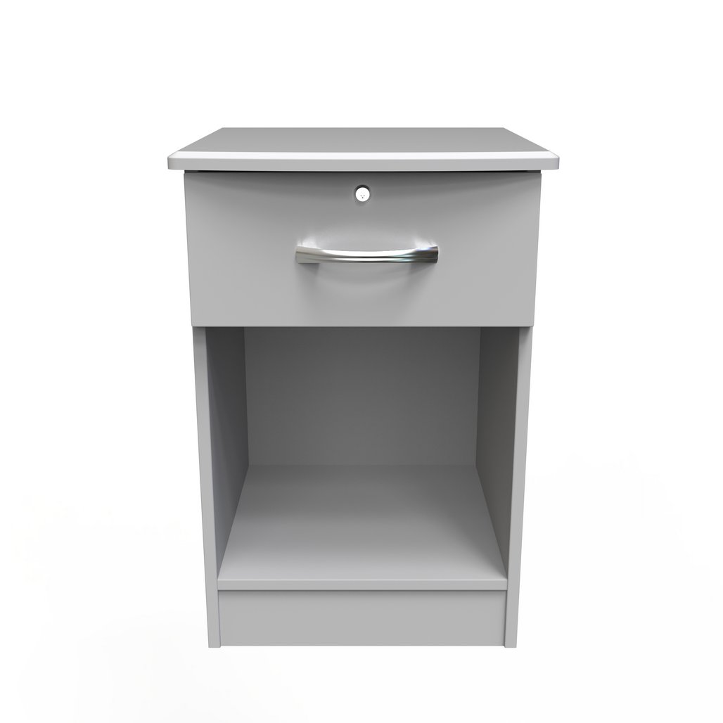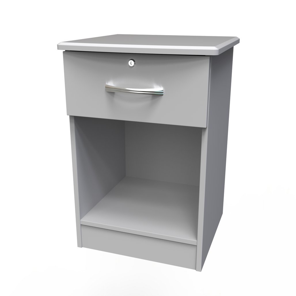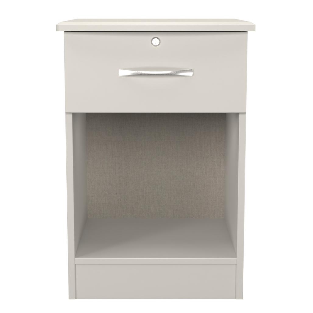 This bedside table has a large open storage area and a lockable drawer. Perfect for the bedside or as a free standing storage unit. This sleek classic range would be suitable for almost any home. With elegant bow metal handles and a tough scratch resistant surface. Available in a choice of wood effect or matt finishes. All our furniture is made in the United Kingdom, to the highest quality. It is delivered direct to your location of choice by one of our two man delivery teams, and comes fully assembled (although legs may be removed to prevent damage in transit).