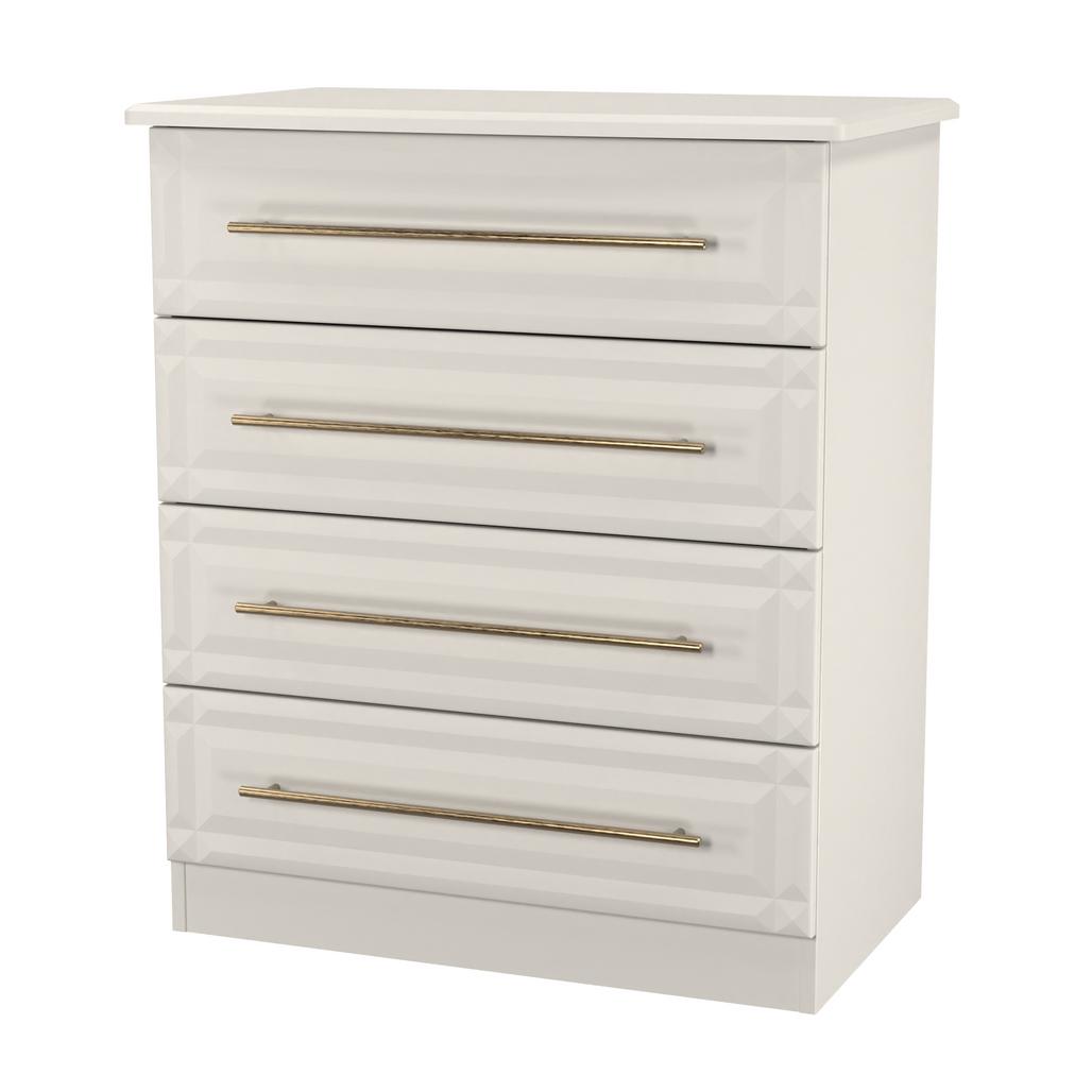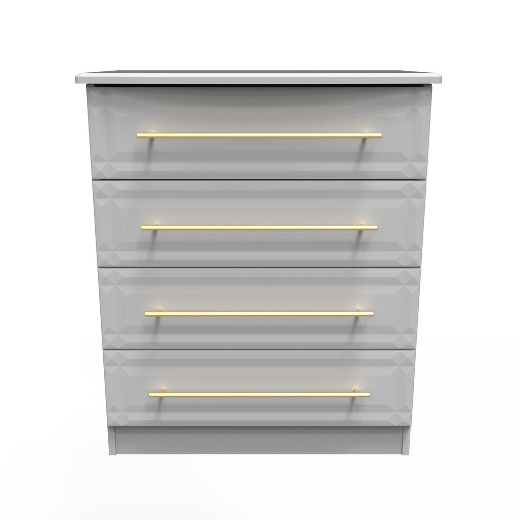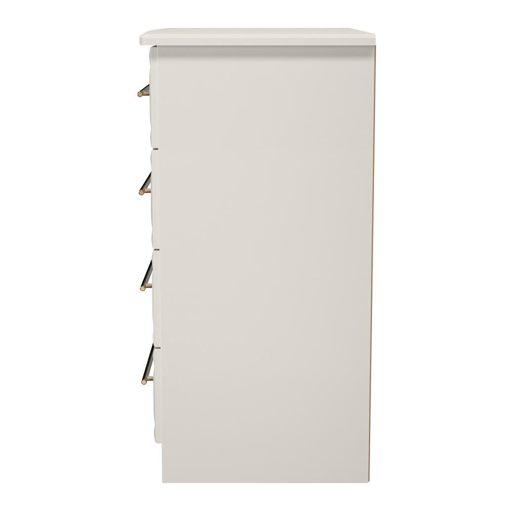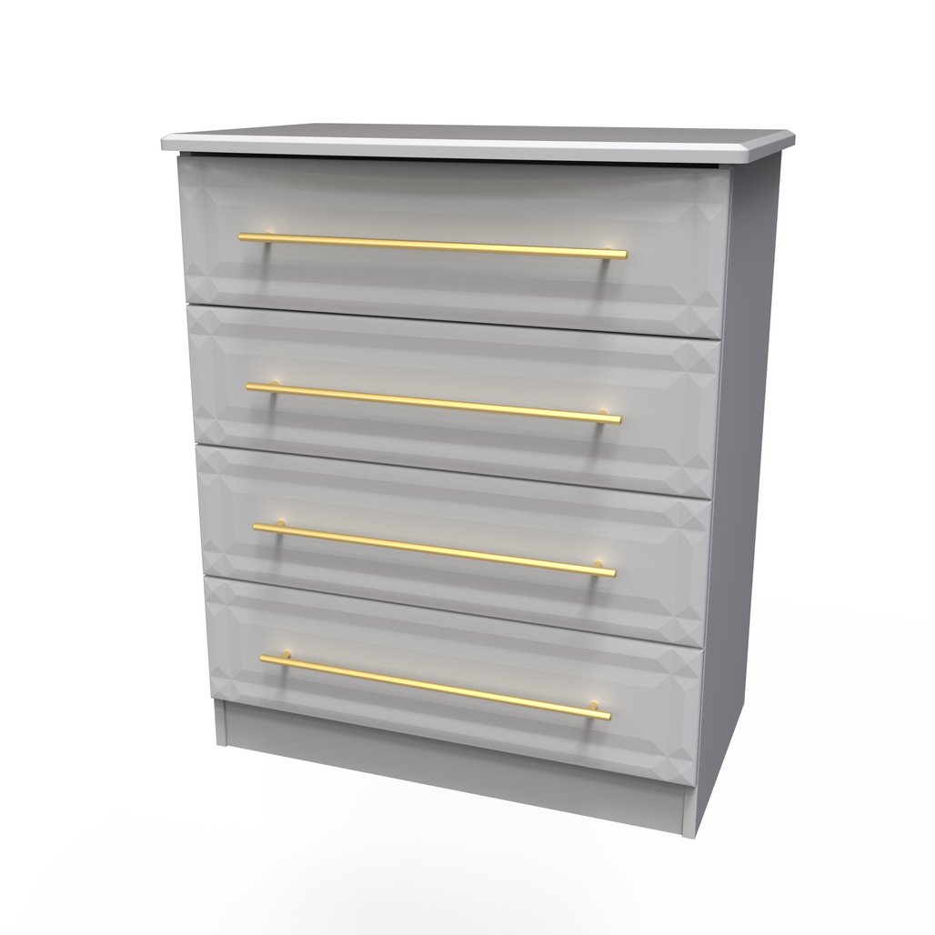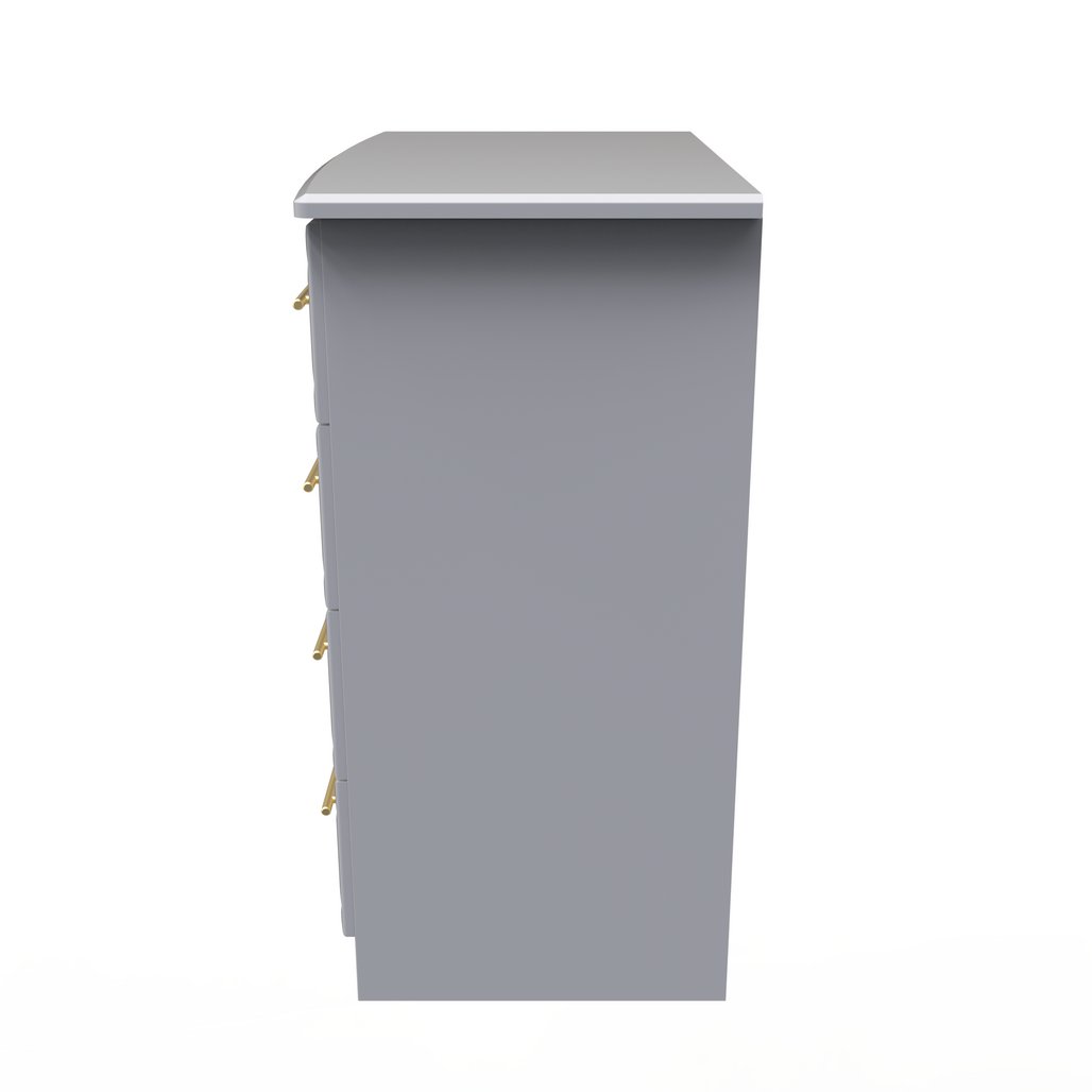 This wide 4 drawer chest of drawers is practical and stylish. Perfect for any home as a free standing storage unit. This range will bring a tough of class to any room. With distinctive carved fronts and elegant gold T-Bar metal handles. Available in a range scratch reistant colours and finishes. All our furniture is made in the United Kingdom, to the highest quality. It is delivered direct to your location of choice by one of our two man delivery teams, and comes fully assembled (although legs may be removed to prevent damage in transit).