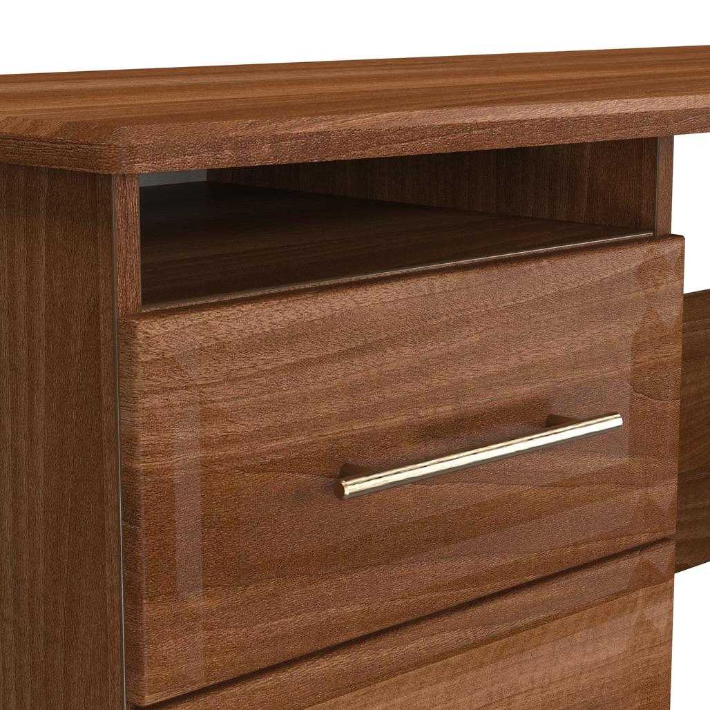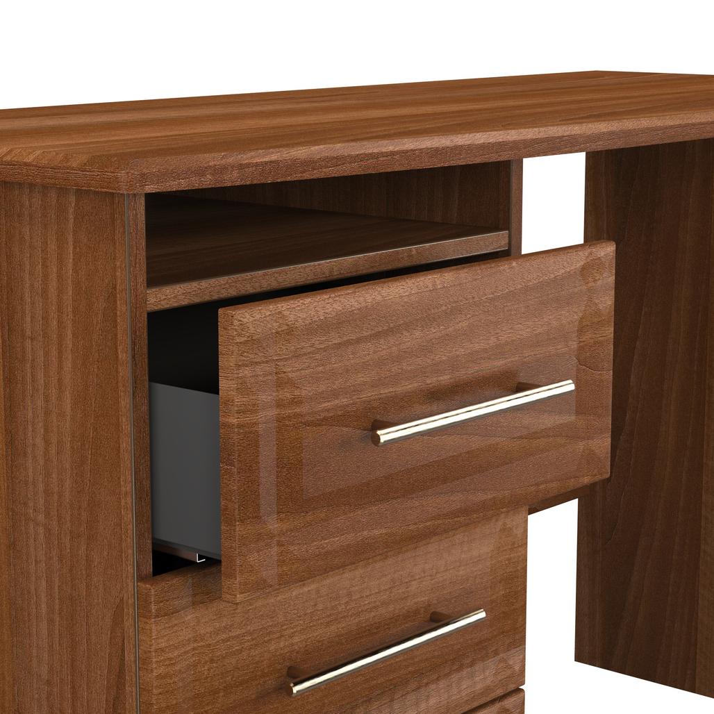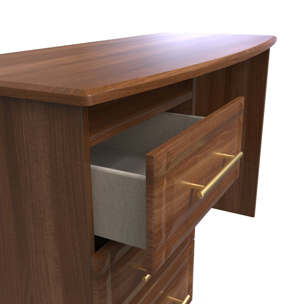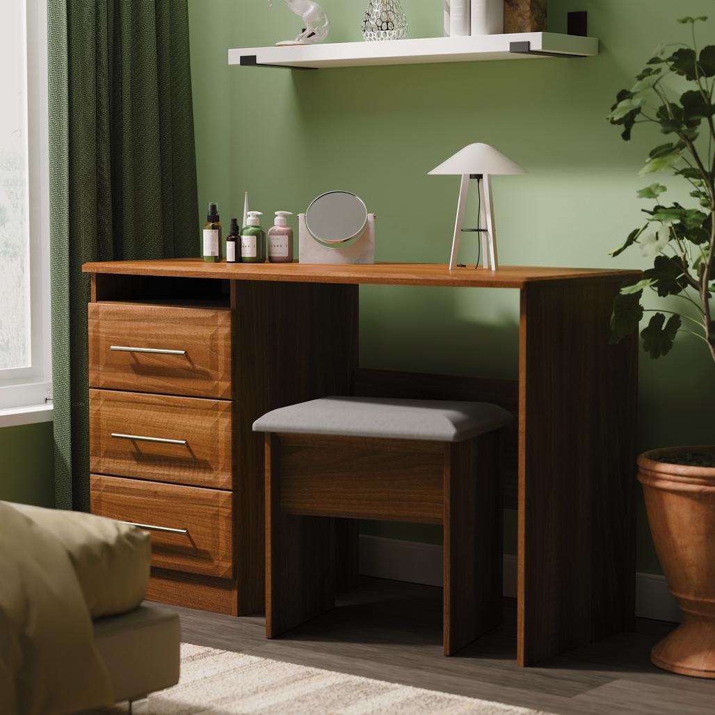 This practical 3 drawer narrow desk/vanity is perfect for any bedroom or office. A matching stool and mirror (in 2 sizes) are also available. This range will bring a tough of class to any room. With distinctive carved fronts and elegant gold T-Bar metal handles. Available in a range scratch reistant colours and finishes. All our furniture is made in the United Kingdom, to the highest quality. It is delivered direct to your location of choice by one of our two man delivery teams, and comes fully assembled (although legs may be removed to prevent damage in transit).