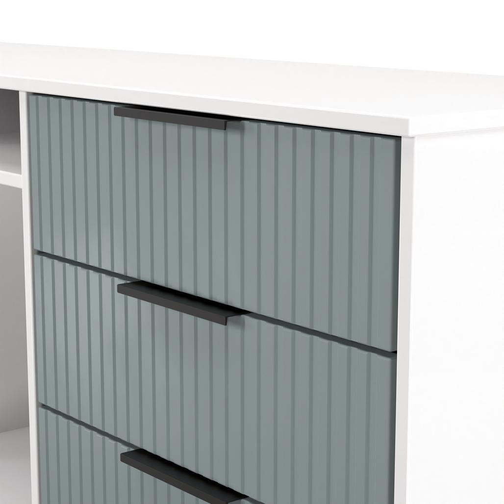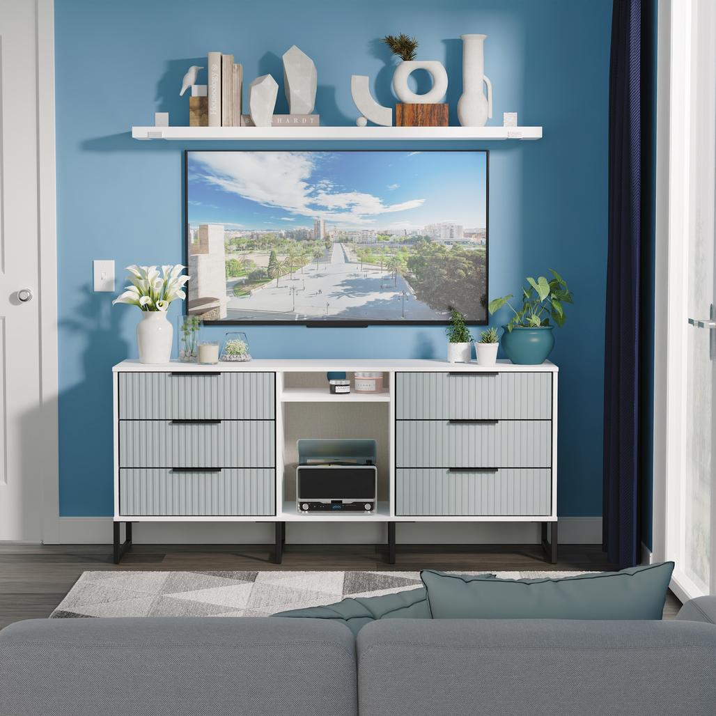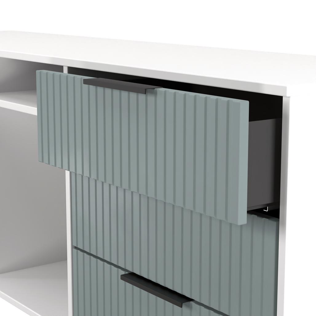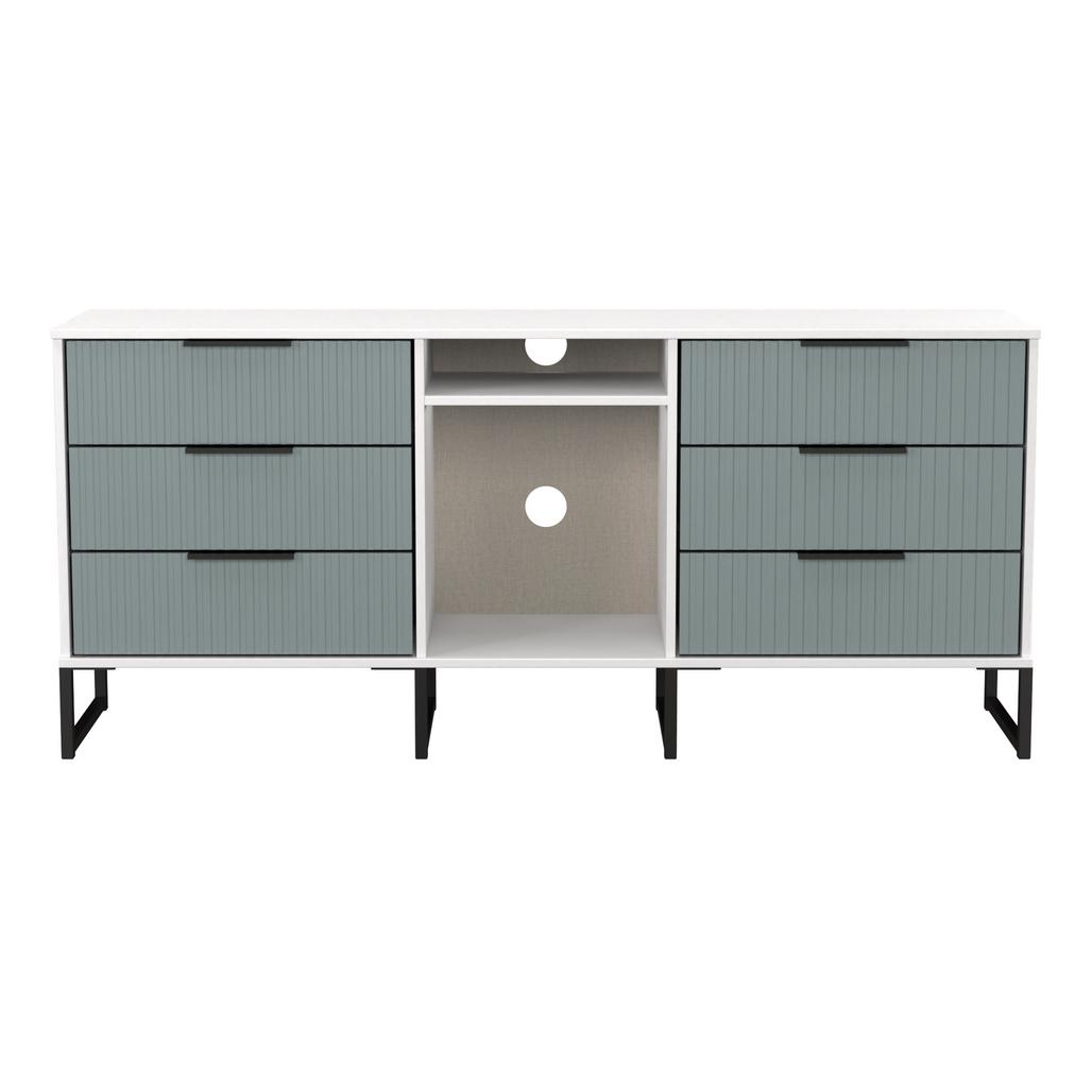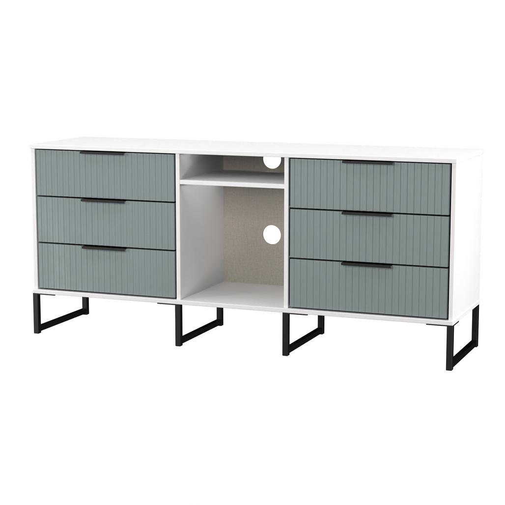 This wide storage unit features 6 storage drawers with a central shelf. Suitable for use as a TV/Media unit or sideboard. A new stand out range, named for the new deep cut "fluted" grove patten of the drawer and door fronts. Featuring black metal handles and black sleigh legs. A striking and individual range that is perfect for the modern home. All our furniture is made in the United Kingdom, to the highest quality using responsibly sourced materials. It is delivered direct to your location of choice by one of our two man delivery teams, and comes fully assembled (although items with legs will have those legs removed during transit to avoid damage).
