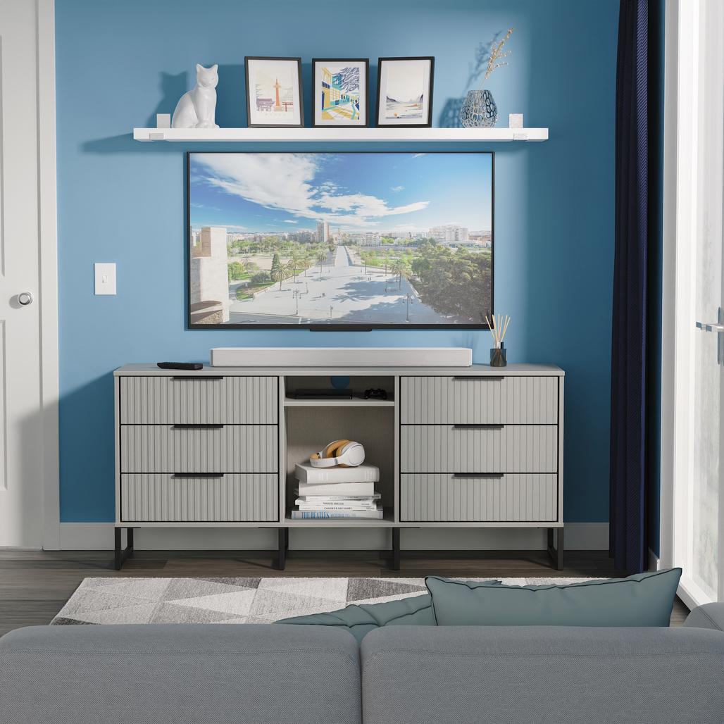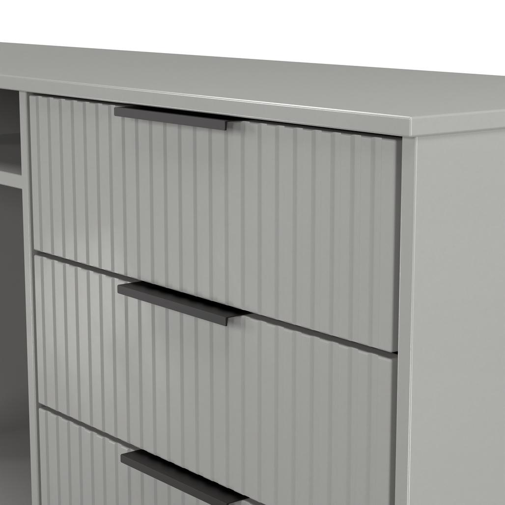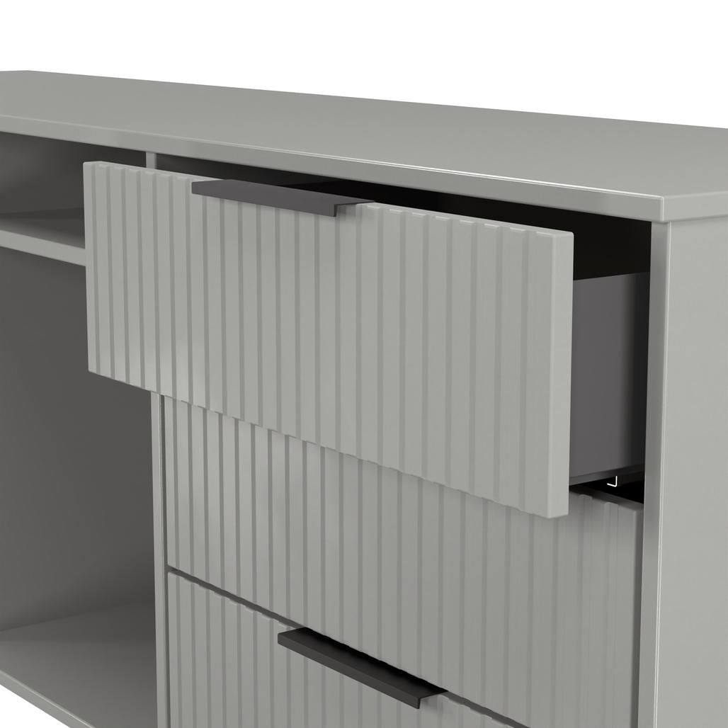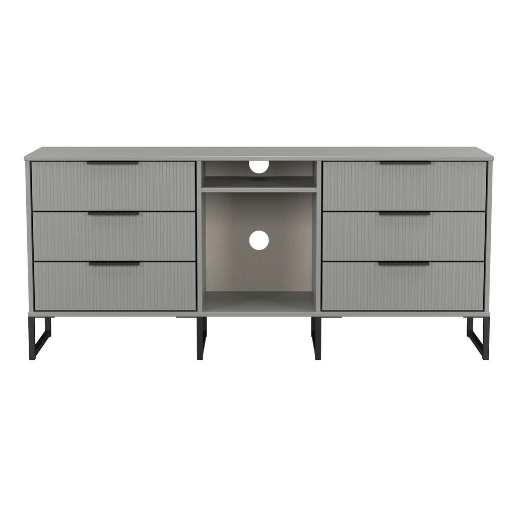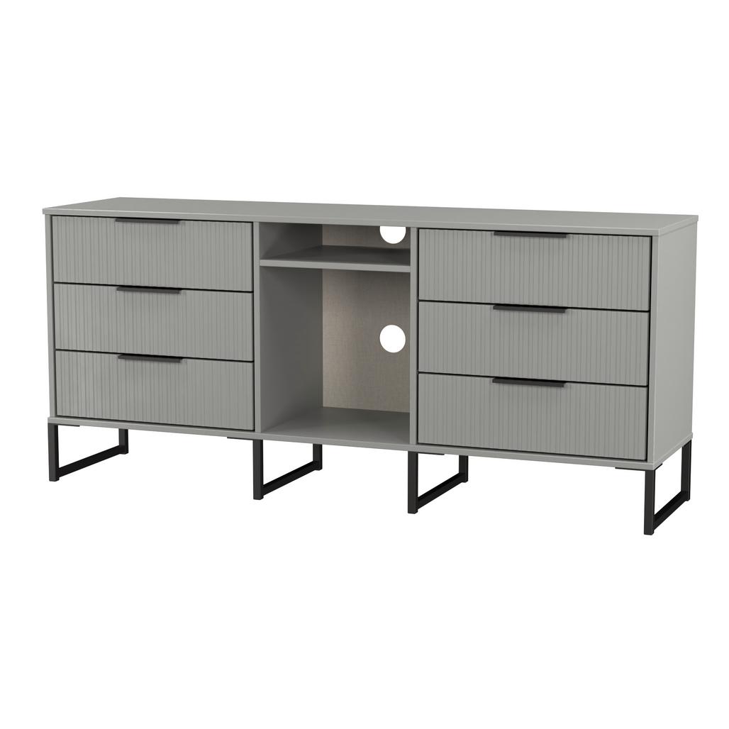 This wide storage unit features 6 storage drawers with a central shelf. Suitable for use as a TV/Media unit or sideboard. A new stand out range, named for the new deep cut "fluted" grove patten of the drawer and door fronts. Featuring black metal handles and black sleigh legs. A striking and individual range that is perfect for the modern home. All our furniture is made in the United Kingdom, to the highest quality using responsibly sourced materials. It is delivered direct to your location of choice by one of our two man delivery teams, and comes fully assembled (although items with legs will have those legs removed during transit to avoid damage).