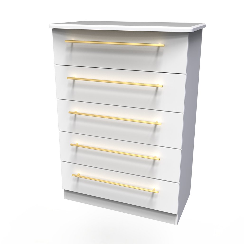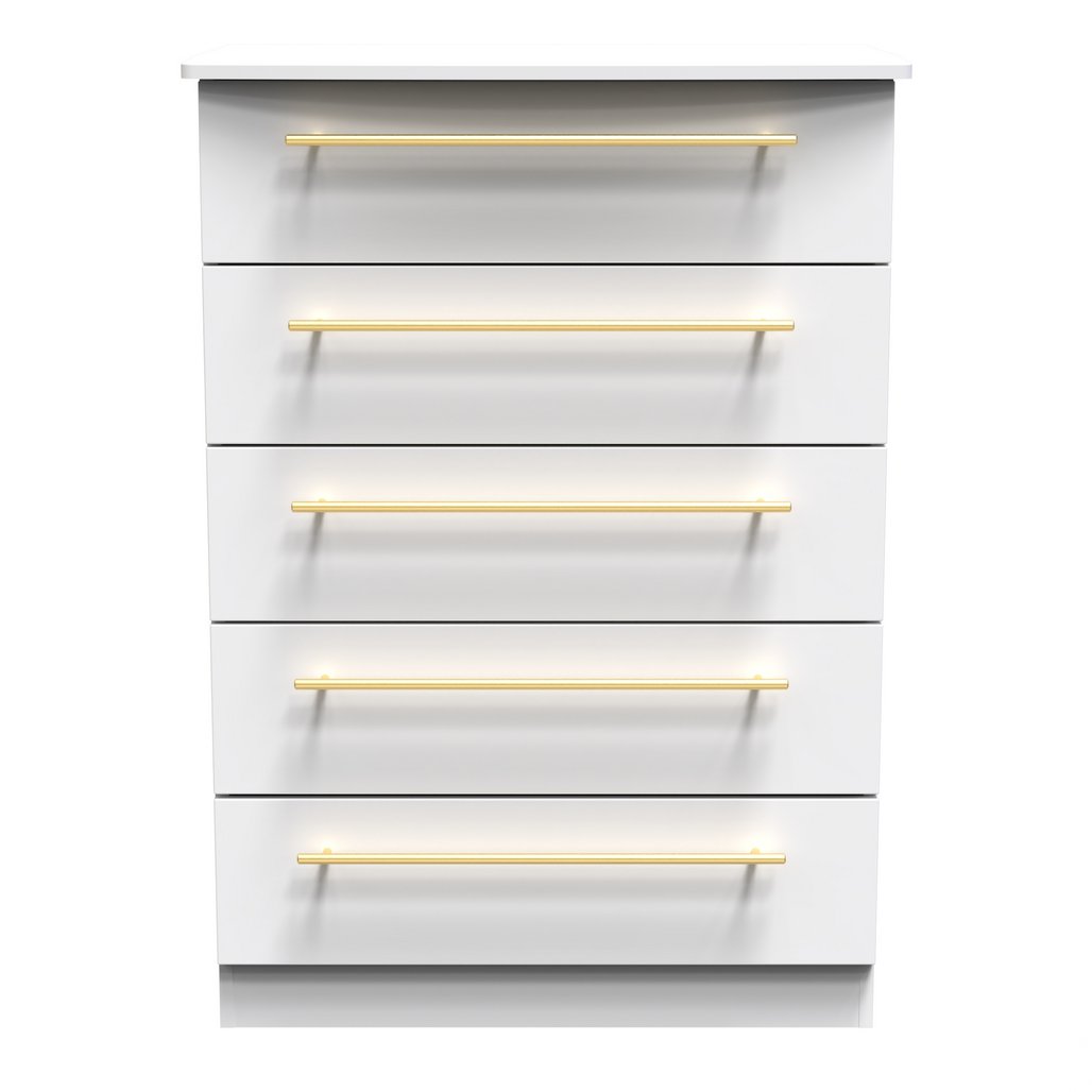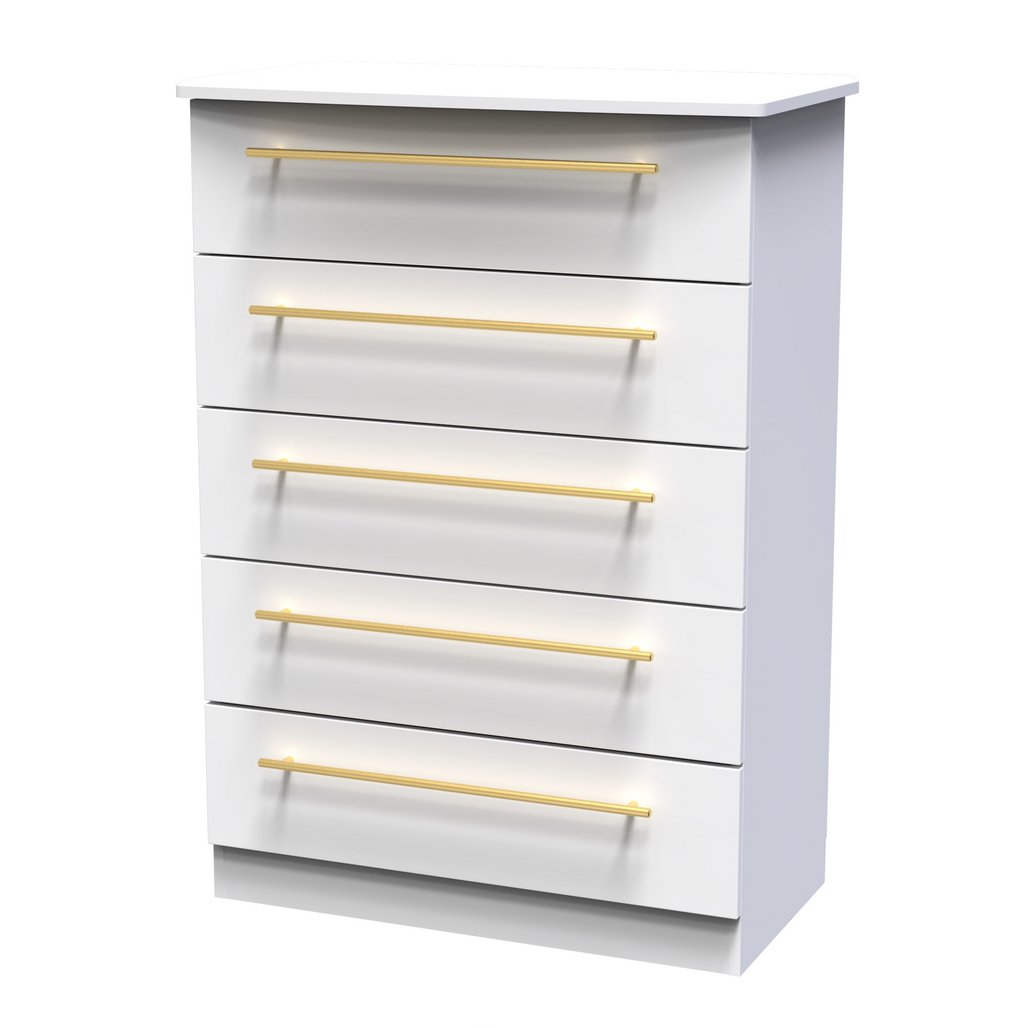 This wide 5 drawer chest of drawers is practical and stylish. Perfect for any home as a free standing storage unit. This range is modern and elegant with a smooth clean design. Features sleek gold T-Bar handles and comes ina range of scratch resistant colours. All our furniture is made in the United Kingdom, to the highest quality. It is delivered direct to your location of choice by one of our two man delivery teams, and comes fully assembled (although legs may be removed to prevent damage in transit).