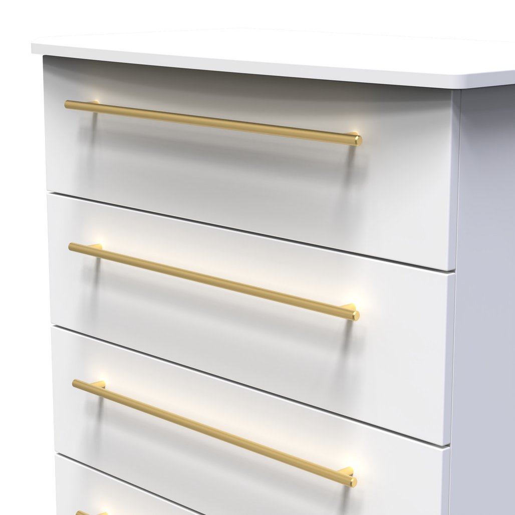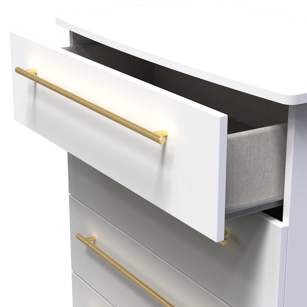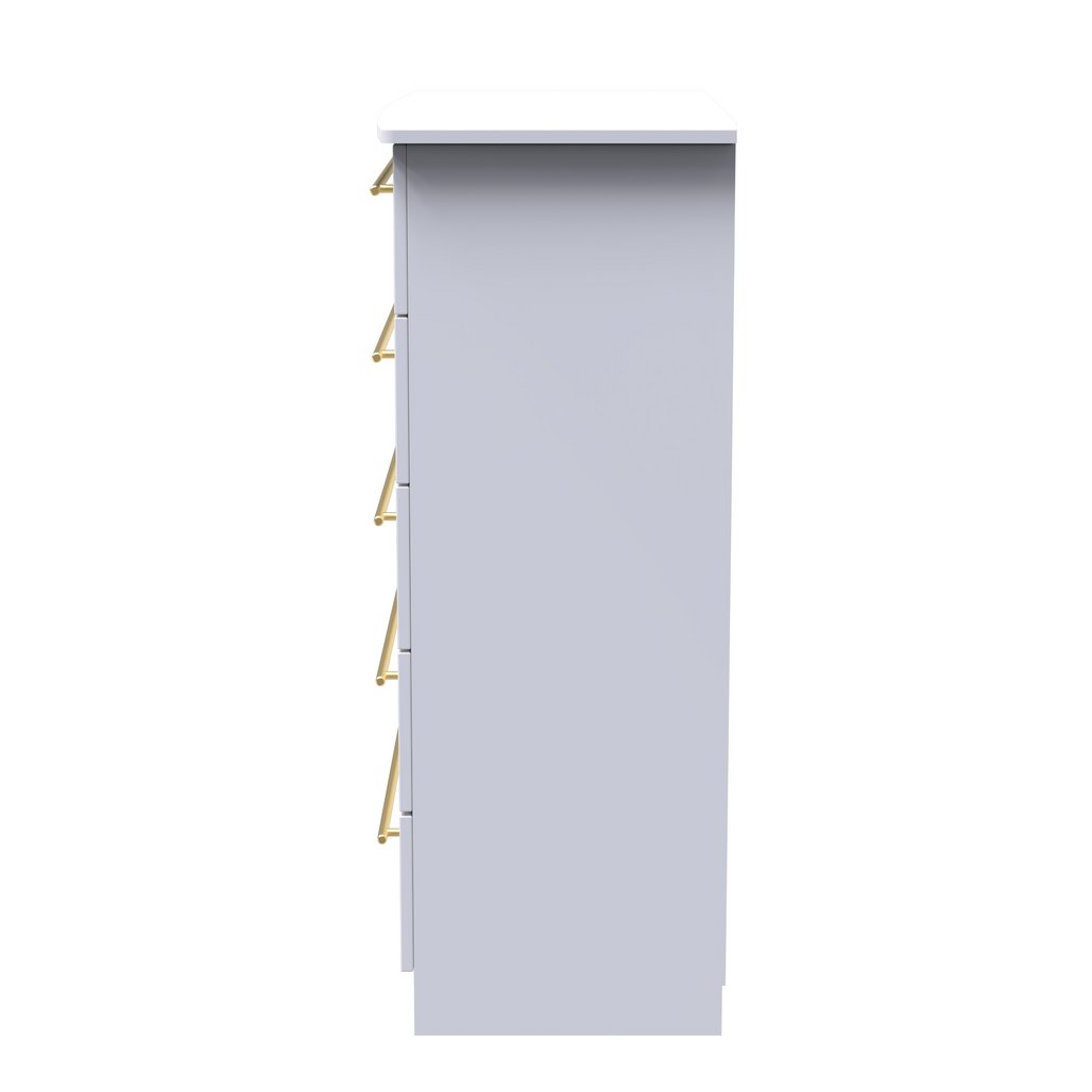 This wide 5 drawer chest of drawers is practical and stylish. Perfect for any home as a free standing storage unit. This range is modern and elegant with a smooth clean design. Features sleek gold T-Bar handles and comes ina range of scratch resistant colours. All our furniture is made in the United Kingdom, to the highest quality. It is delivered direct to your location of choice by one of our two man delivery teams, and comes fully assembled (although legs may be removed to prevent damage in transit).