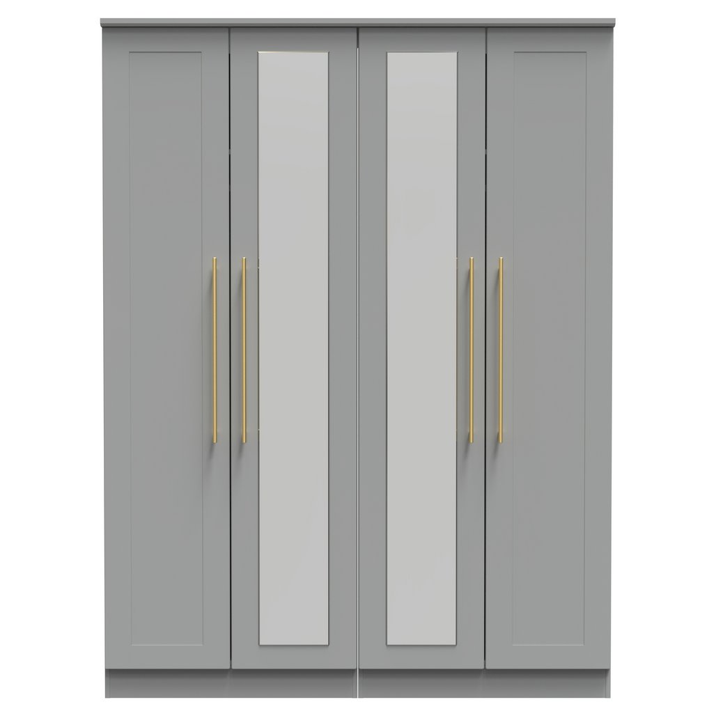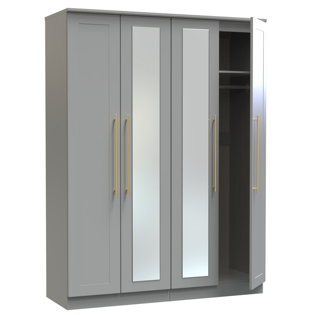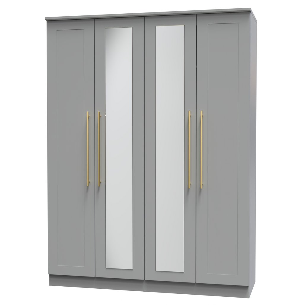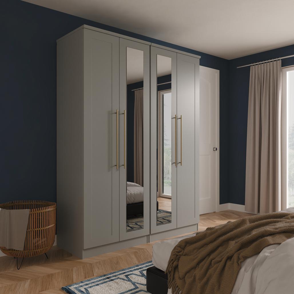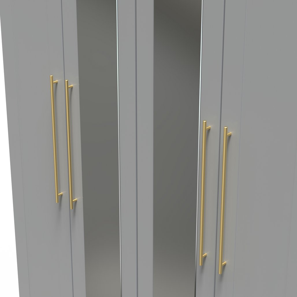 This tall 4 door wardrobe provides an increased storage solution for your clothes. Also features 2 full height central mirrored doors. This range is modern and elegant with a smooth clean design. Features sleek gold T-Bar handles and comes ina range of scratch resistant colours. All our furniture is made in the United Kingdom, to the highest quality. It is delivered direct to your location of choice by one of our two man delivery teams, and comes fully assembled (although legs may be removed to prevent damage in transit).