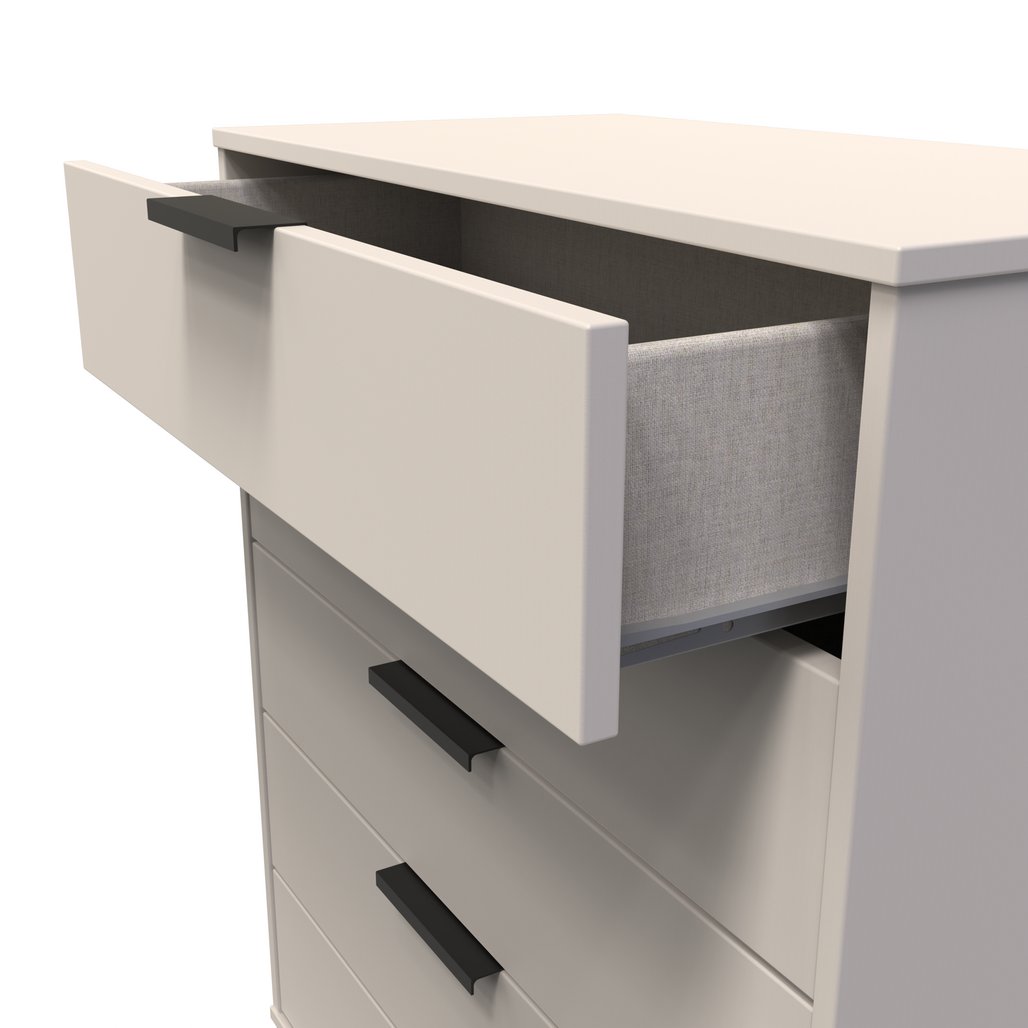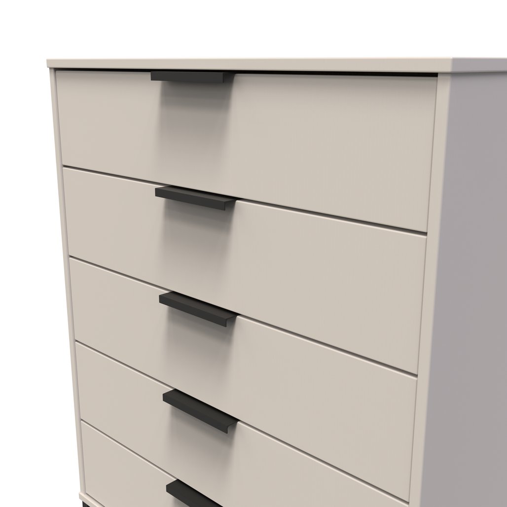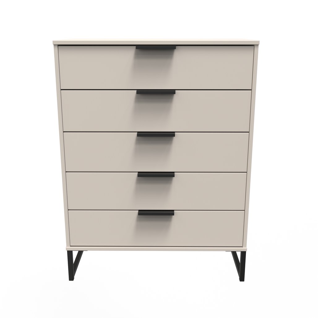 This wide 5 drawer chest of drawers is practical and stylish. Perfect for any home as a free standing storage unit. Choosing between subtle neutral and elegant earthy tones, you'll be amazed at how well this collection can enhance a space. You can be certain it will be engaging, with a sophisticated and durable finish. The extensive colour options are complimented with a variety of different leg options All our furniture is made in the United Kingdom, to the highest quality. It is delivered direct to your location of choice by one of our two man delivery teams, and comes fully assembled (although legs may be removed to prevent damage in transit).
