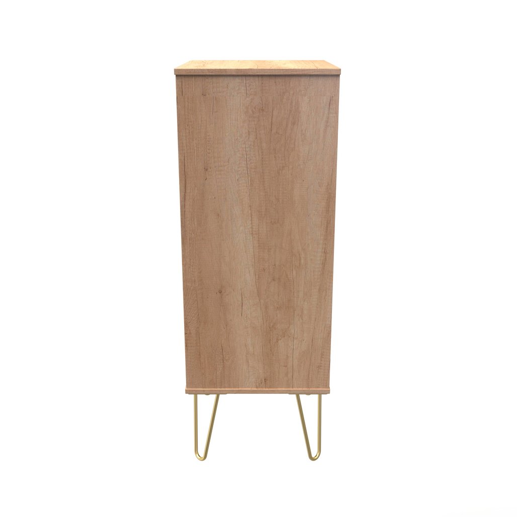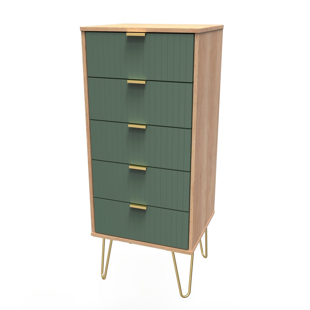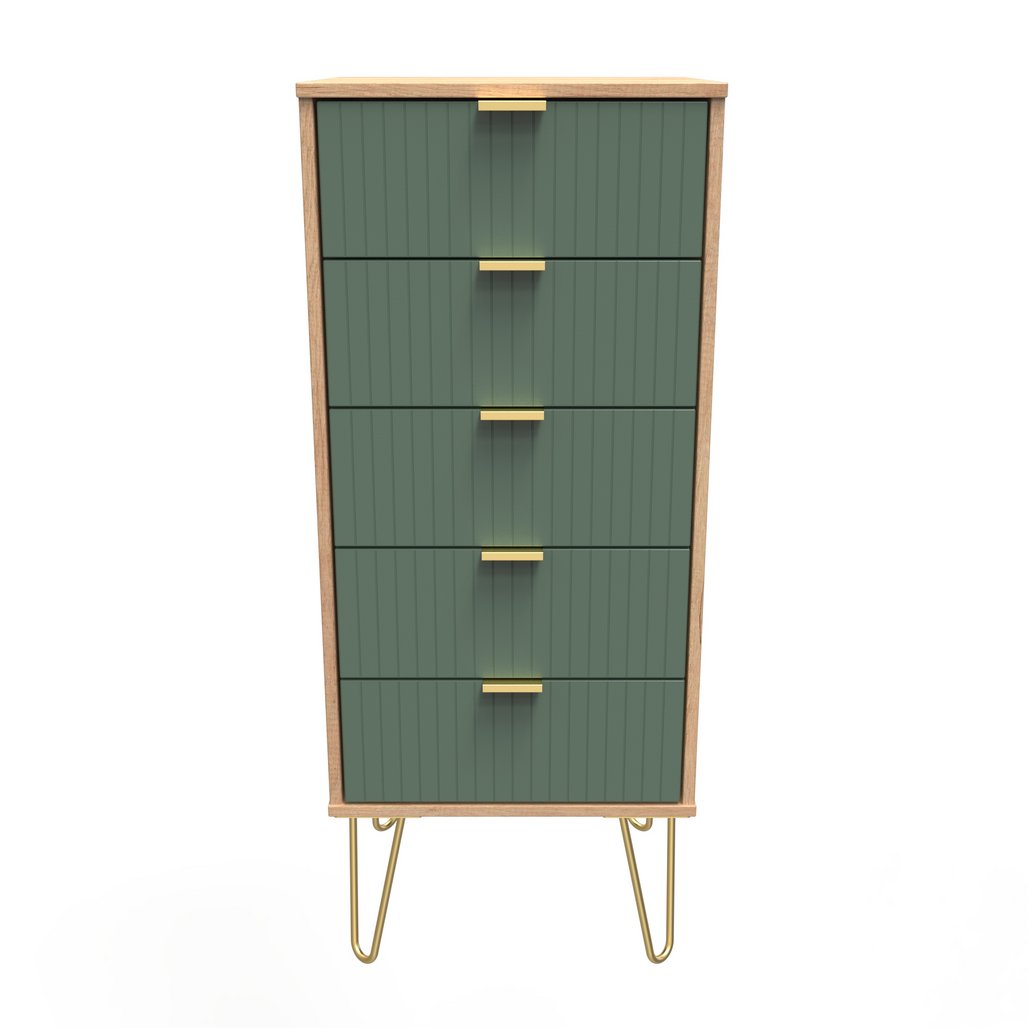 This 5 drawer chest of drawers is practical and stylish. Perfect for any home as a free standing storage unit. A modern and distinctive range. Named for the unique "Linear" patten of the drawer and door fronts. Also features Gold Metal Handles and Gold Hairpin Legs. Comes in a wide range of colours including eye cathching two tone colour combinations. All our furniture is made in the United Kingdom, to the highest quality. It is delivered direct to your location of choice by one of our two man delivery teams, and comes fully assembled (although legs may be removed to prevent damage in transit).