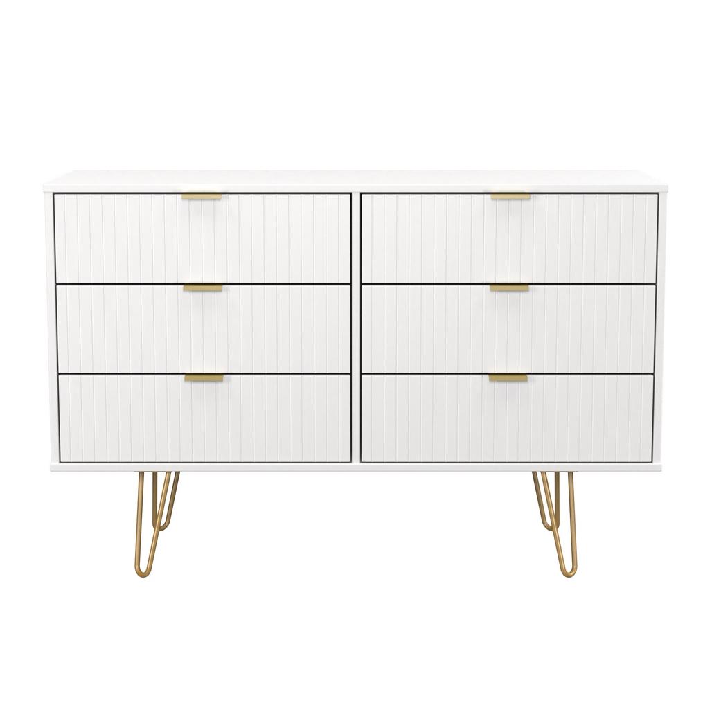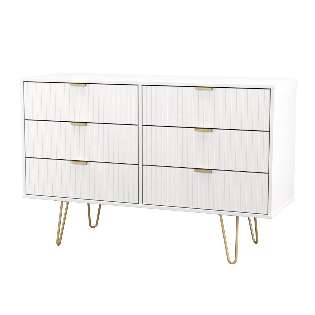 This double width 6 drawer chest of drawers is practical and stylish. Perfect for any home as a free standing storage unit. A modern and distinctive range. Named for the unique "Linear" patten of the drawer and door fronts. Also features Gold Metal Handles and Gold Hairpin Legs. Comes in a wide range of colours including eye cathching two tone colour combinations. All our furniture is made in the United Kingdom, to the highest quality. It is delivered direct to your location of choice by one of our two man delivery teams, and comes fully assembled (although legs may be removed to prevent damage in transit).