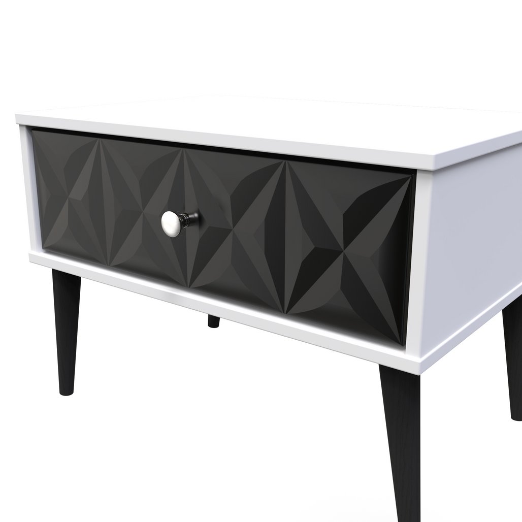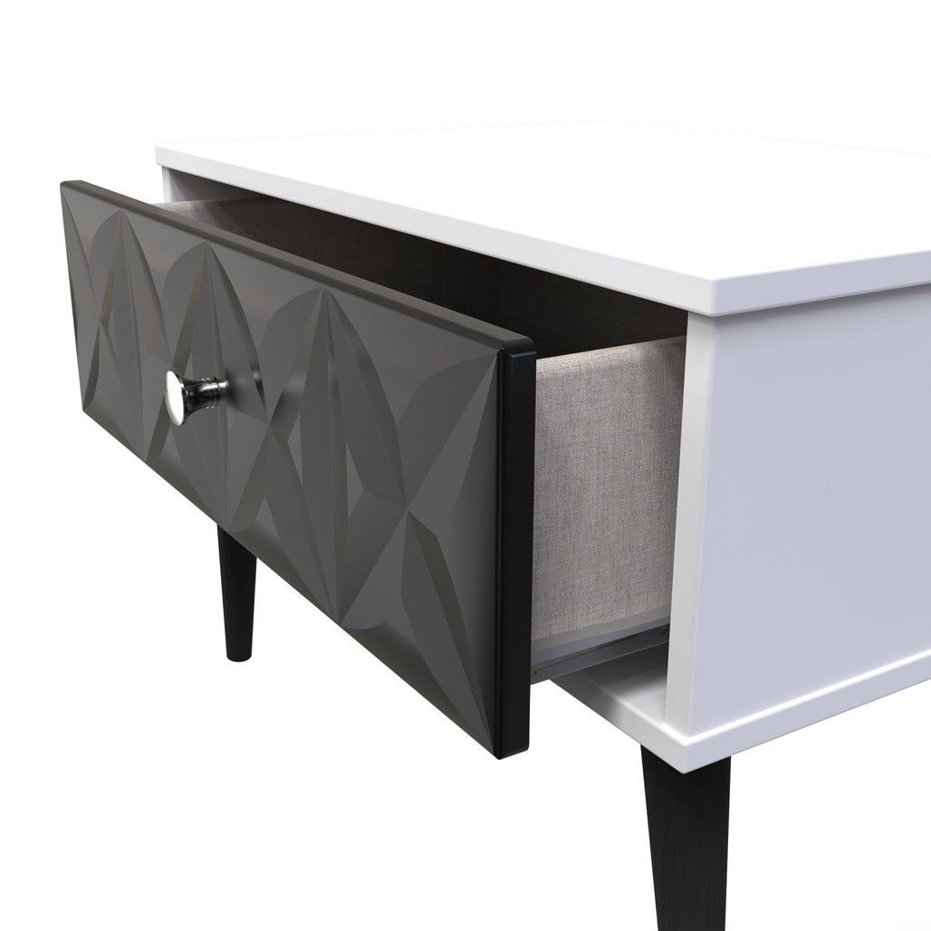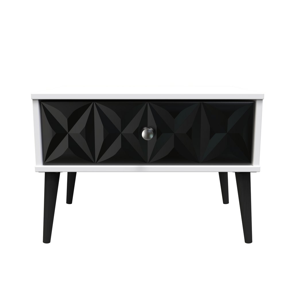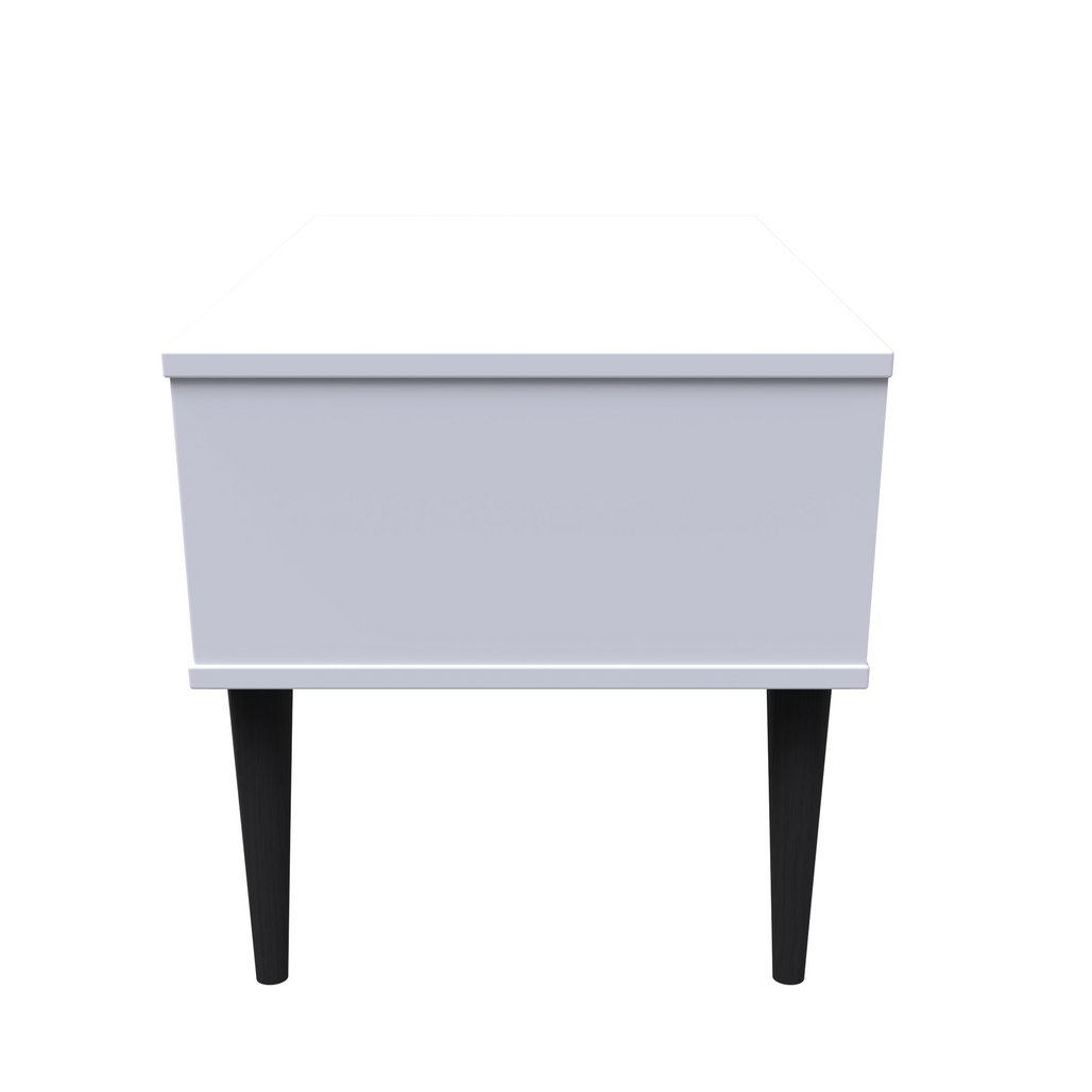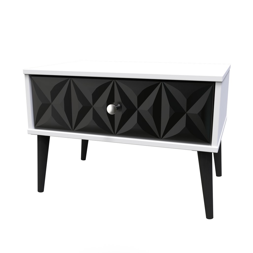 This single drawer bedside cabinet is wider than normal for added practicality. Perfect for any bedside or as a free standing storage unit. A modern and distinctive range. Named for the unique "Pixel" patten of the drawer and door fronts. Also features Black Metal Handles and Black Hairpin Legs. Comes in a wide range of colours including eye cathching two tone colour combinations. All our furniture is made in the United Kingdom, to the highest quality. It is delivered direct to your location of choice by one of our two man delivery teams, and comes fully assembled (although legs may be removed to prevent damage in transit).