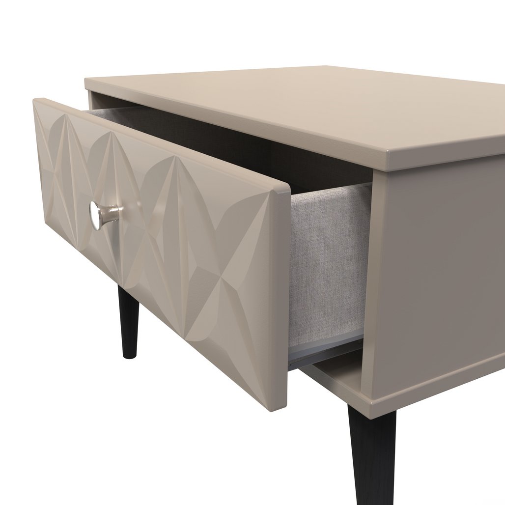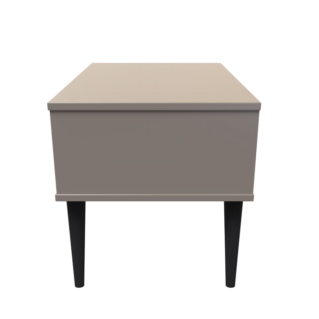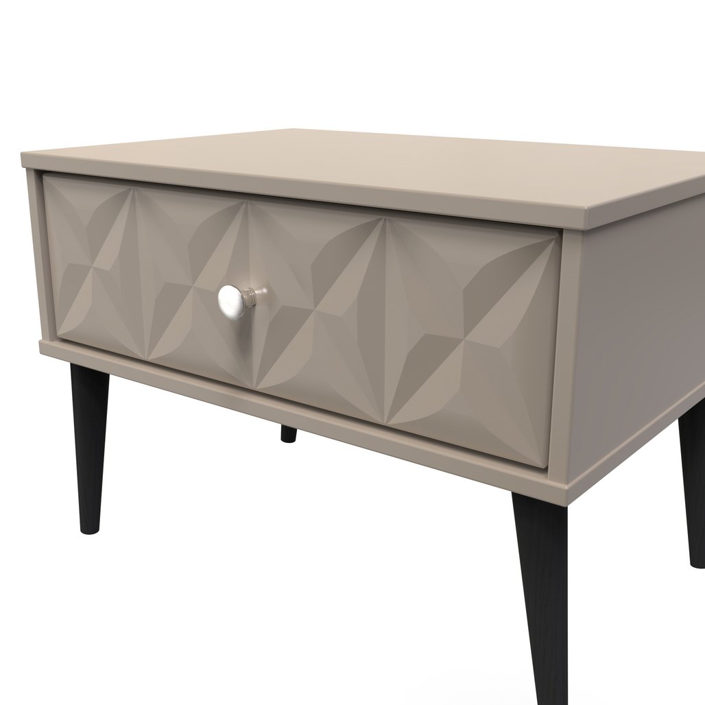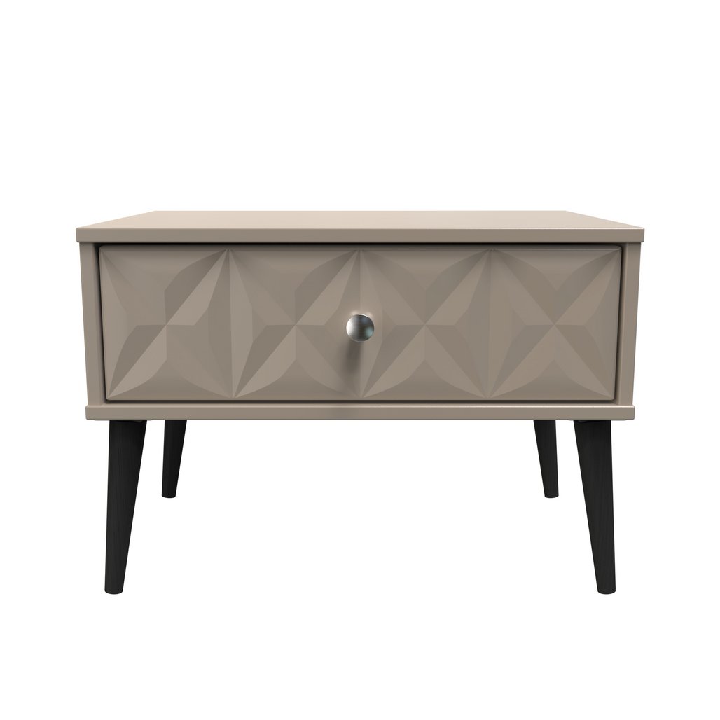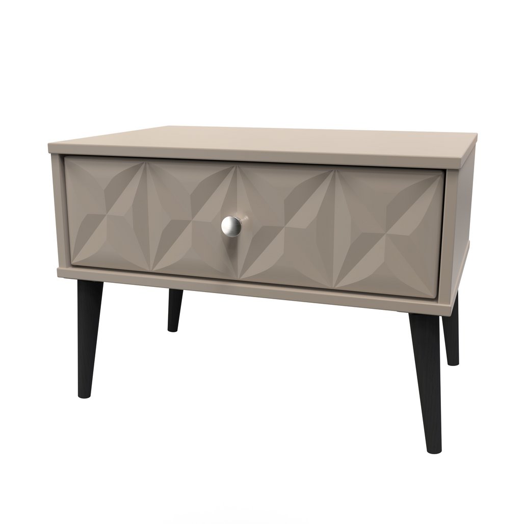 This single drawer bedside cabinet is wider than normal for added practicality. Perfect for any bedside or as a free standing storage unit. A modern and distinctive range. Named for the unique "Pixel" patten of the drawer and door fronts. Also features Black Metal Handles and Black Hairpin Legs. Comes in a wide range of colours including eye cathching two tone colour combinations. All our furniture is made in the United Kingdom, to the highest quality. It is delivered direct to your location of choice by one of our two man delivery teams, and comes fully assembled (although legs may be removed to prevent damage in transit).