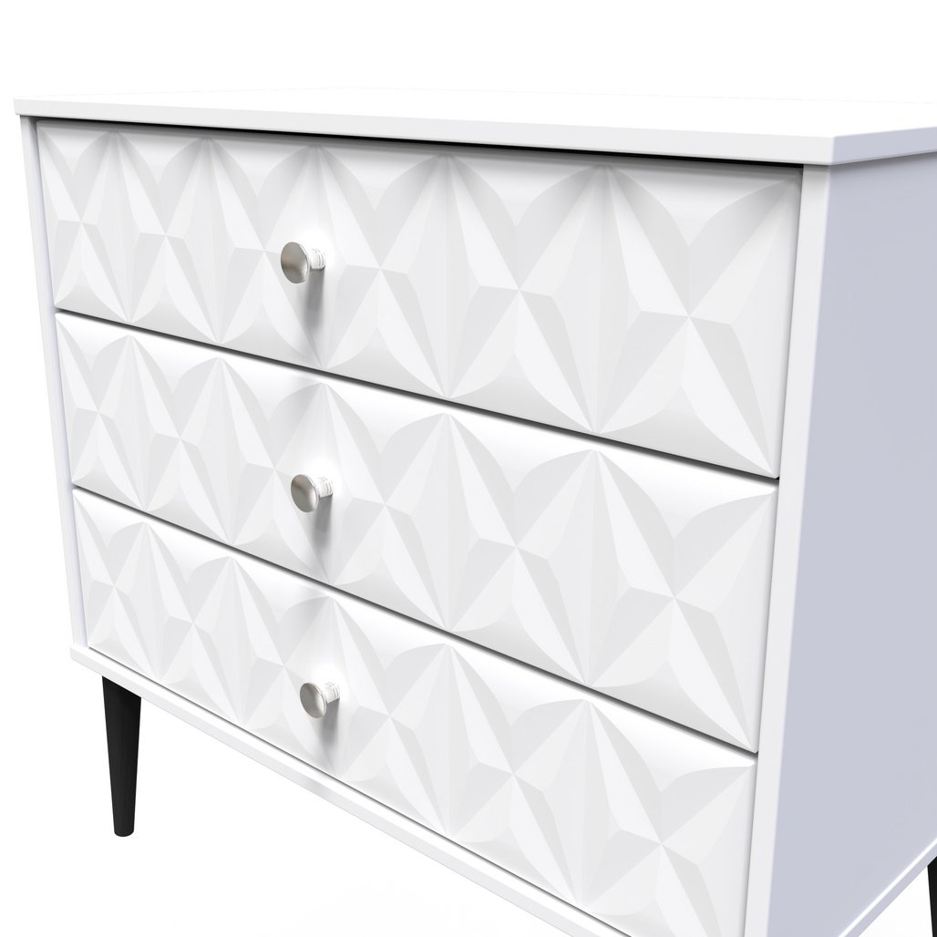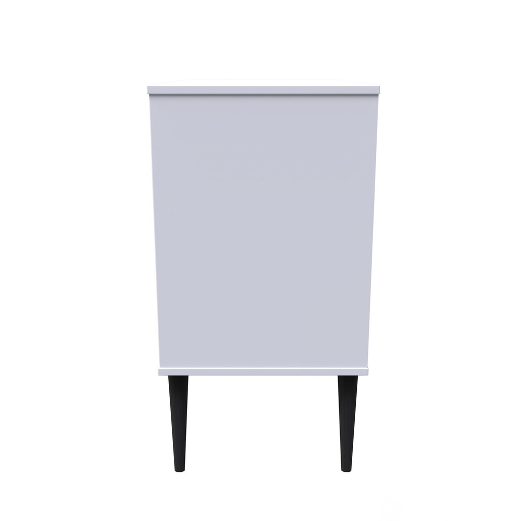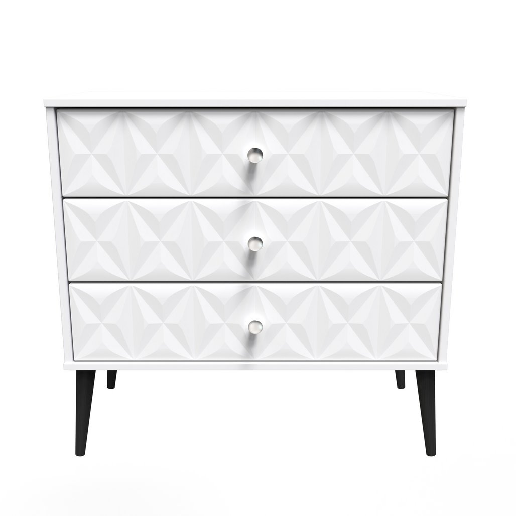 This wide 3 drawer chest of drawers is practical and stylish. Perfect for any home as a free standing storage unit. A modern and distinctive range. Named for the unique "Pixel" patten of the drawer and door fronts. Also features Black Metal Handles and Black Hairpin Legs. Comes in a wide range of colours including eye cathching two tone colour combinations. All our furniture is made in the United Kingdom, to the highest quality. It is delivered direct to your location of choice by one of our two man delivery teams, and comes fully assembled (although legs may be removed to prevent damage in transit).