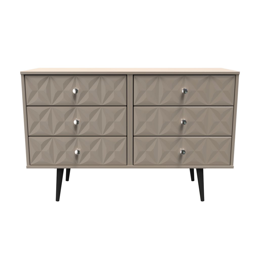 This double width 6 drawer chest of drawers is practical and stylish. Perfect for any home as a free standing storage unit. A modern and distinctive range. Named for the unique "Pixel" patten of the drawer and door fronts. Also features Black Metal Handles and Black Hairpin Legs. Comes in a wide range of colours including eye cathching two tone colour combinations. All our furniture is made in the United Kingdom, to the highest quality. It is delivered direct to your location of choice by one of our two man delivery teams, and comes fully assembled (although legs may be removed to prevent damage in transit).