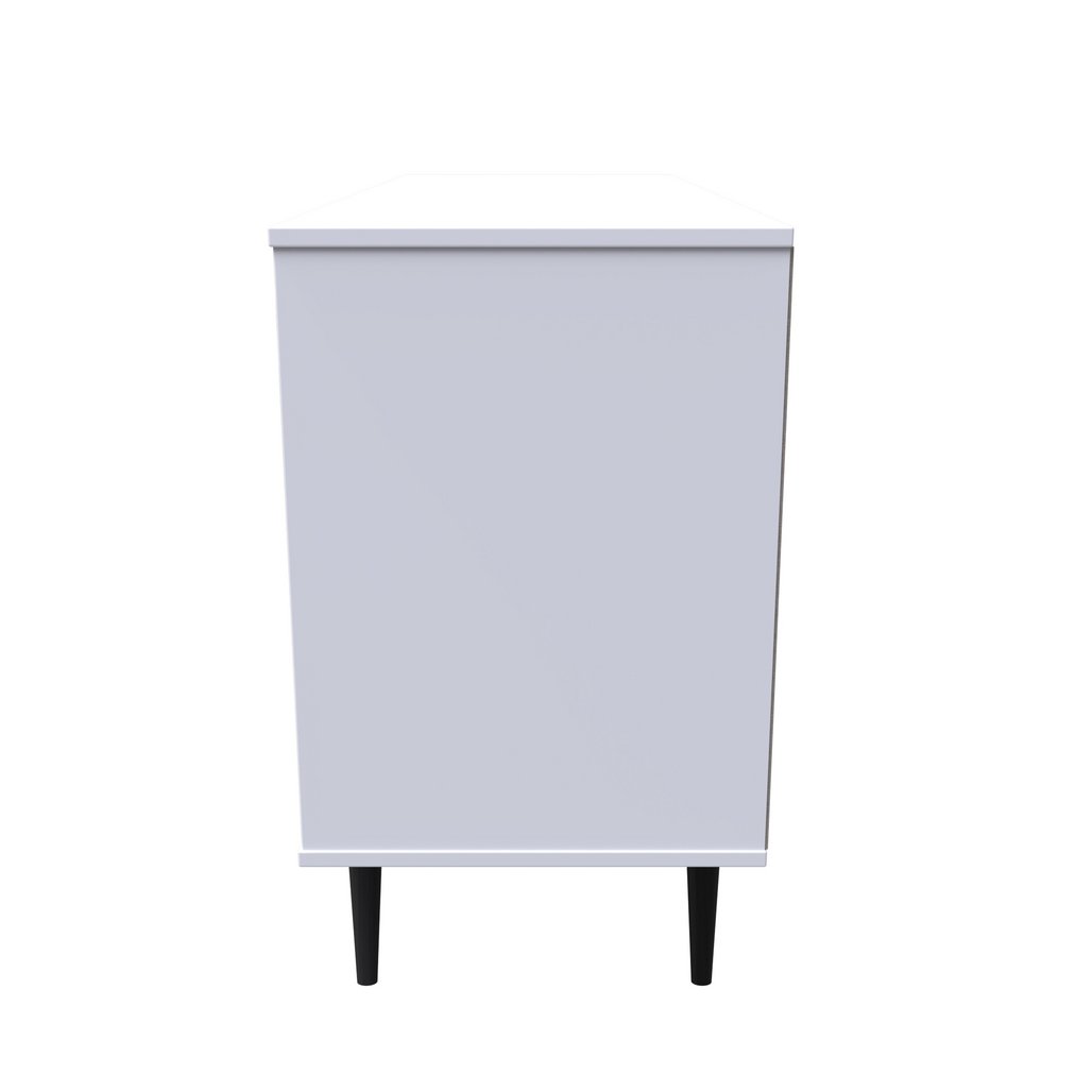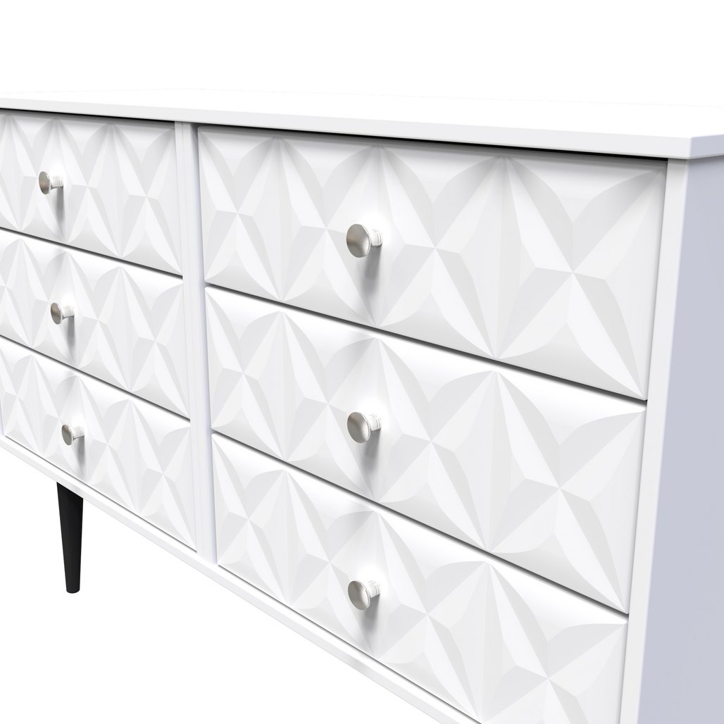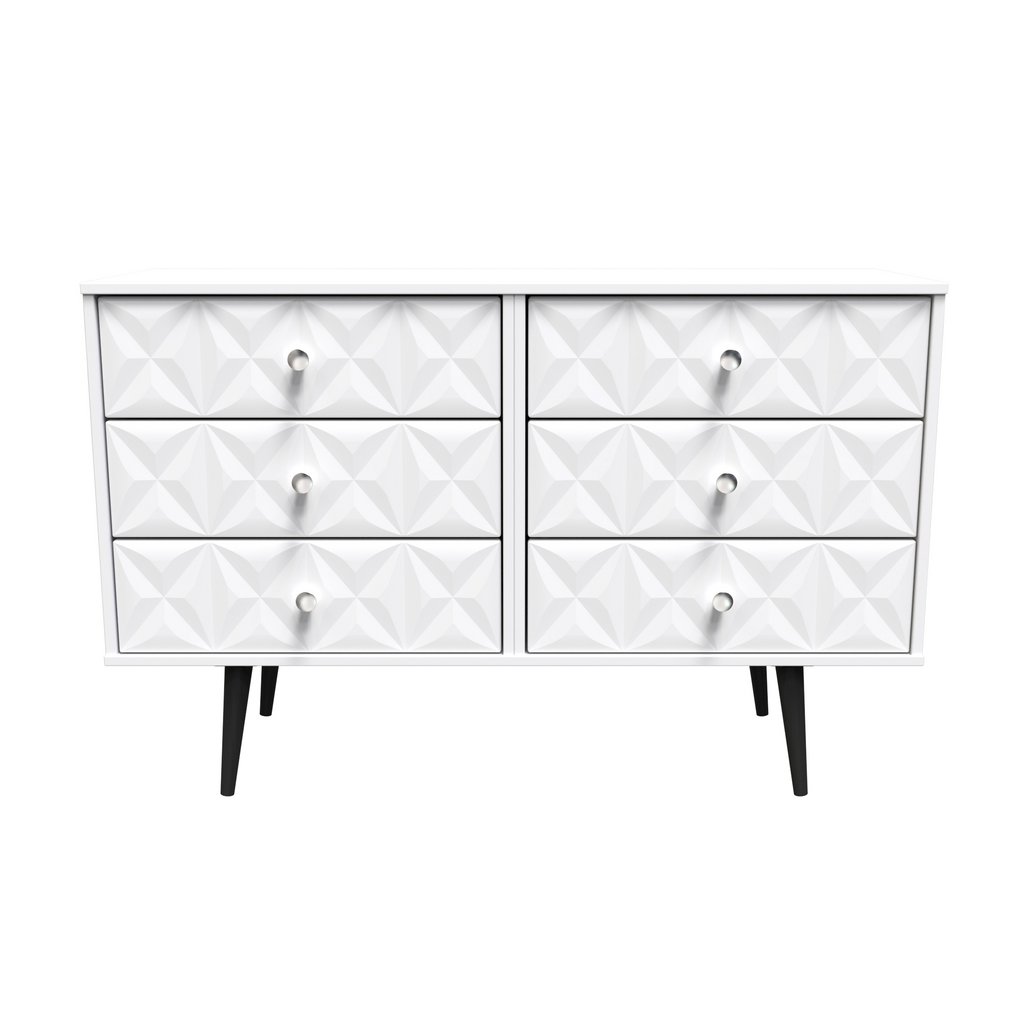 This double width 6 drawer chest of drawers is practical and stylish. Perfect for any home as a free standing storage unit. A modern and distinctive range. Named for the unique "Pixel" patten of the drawer and door fronts. Also features Black Metal Handles and Black Hairpin Legs. Comes in a wide range of colours including eye cathching two tone colour combinations. All our furniture is made in the United Kingdom, to the highest quality. It is delivered direct to your location of choice by one of our two man delivery teams, and comes fully assembled (although legs may be removed to prevent damage in transit).