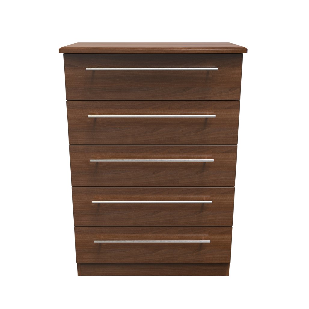 This wide 5 drawer chest of drawers is practical and stylish. Perfect for any home as a free standing storage unit. The elegant, stylish Sherwood range is available in a range of durable scratch resistant natural wood or matt finishes. With metal T-Bar handles on all doors and drawers. All drawers come with long lasting metal drawer runners and a linen effect interior. All our furniture is made in the United Kingdom, to the highest quality. It is delivered direct to your location of choice by one of our two man delivery teams, and comes fully assembled (although legs may be removed to prevent damage in transit).
