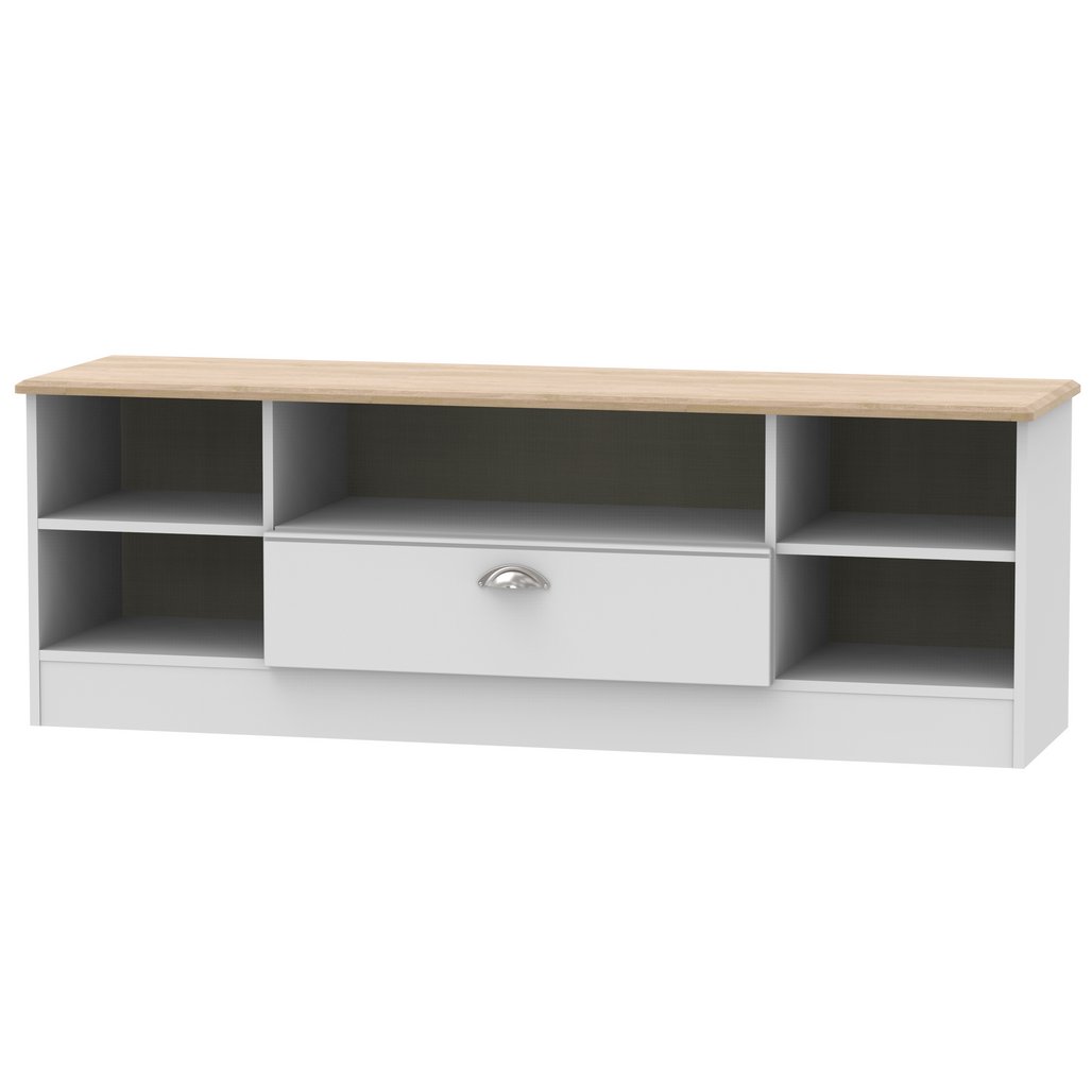 This wide low level TV Corner unit features plenty of open shelving and a central storage drawer and will support a flat screen TV of up to 65" It's easy to create a bedroom that showcases effortless chic, with this stylish range. The shaker-inspired design exudes understated luxury, each piece is finished in a number of colours with brushed steel handles and the option of a contrasting oak effect top. A well-thought-out mix of hanging and flat storage that's suitable for any room. All our furniture is made in the United Kingdom, to the highest quality. It is delivered direct to your location of choice by one of our two man delivery teams, and comes fully assembled (although legs may be removed to prevent damage in transit).