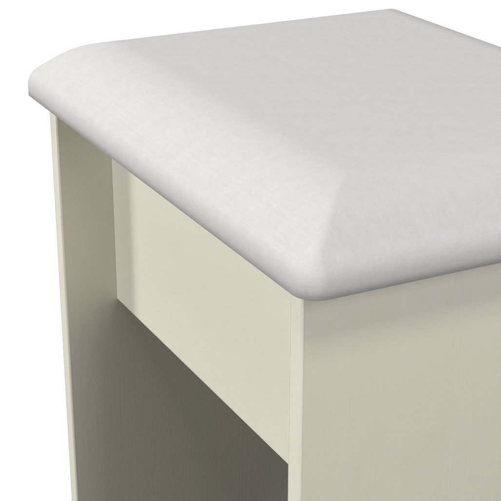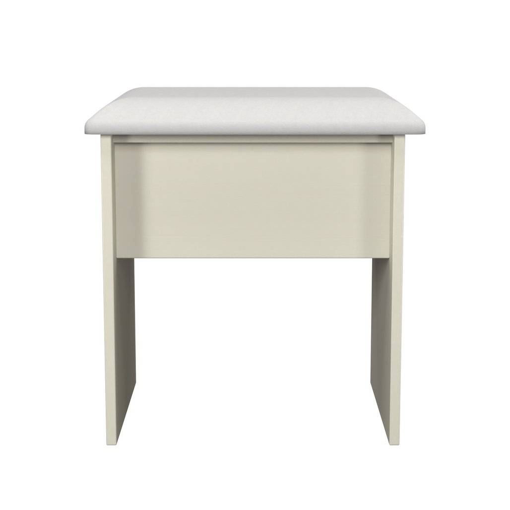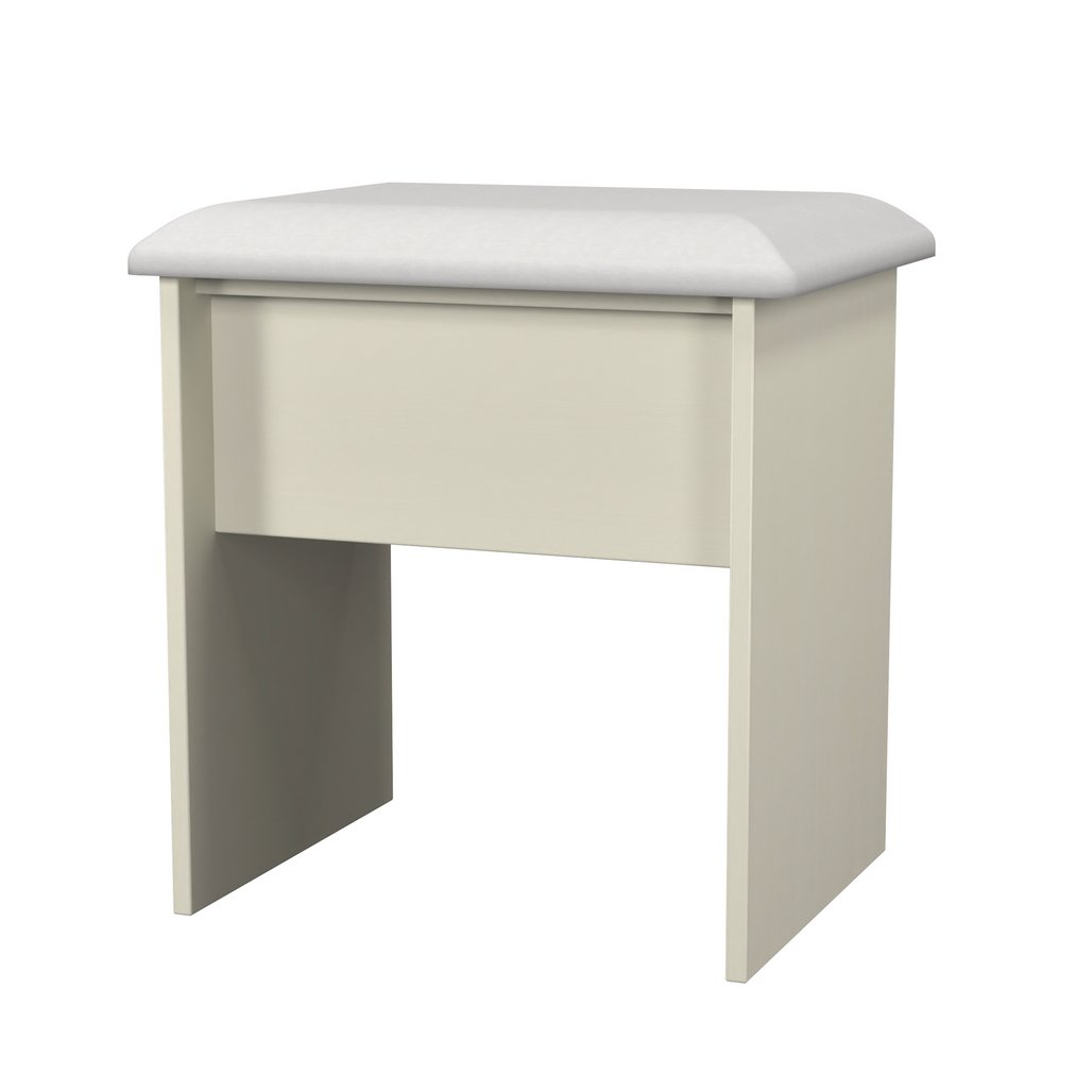 A small vanity stool. A light simple, yet sturdy design, with a soft cushioned seat. Makes an idea companion to a desk or vanity. The natural beauty of the Warwick bedroom range is complemented with curved tops and a variety of colour options. Enhanced by a delicate grooved design on all doors and drawers, with optional contrasting oak effect tops and handles this stunning bedroom range will suit any interior. All our furniture is made in the United Kingdom, to the highest quality. It is delivered direct to your location of choice by one of our two man delivery teams, and comes fully assembled (although legs may be removed to prevent damage in transit).