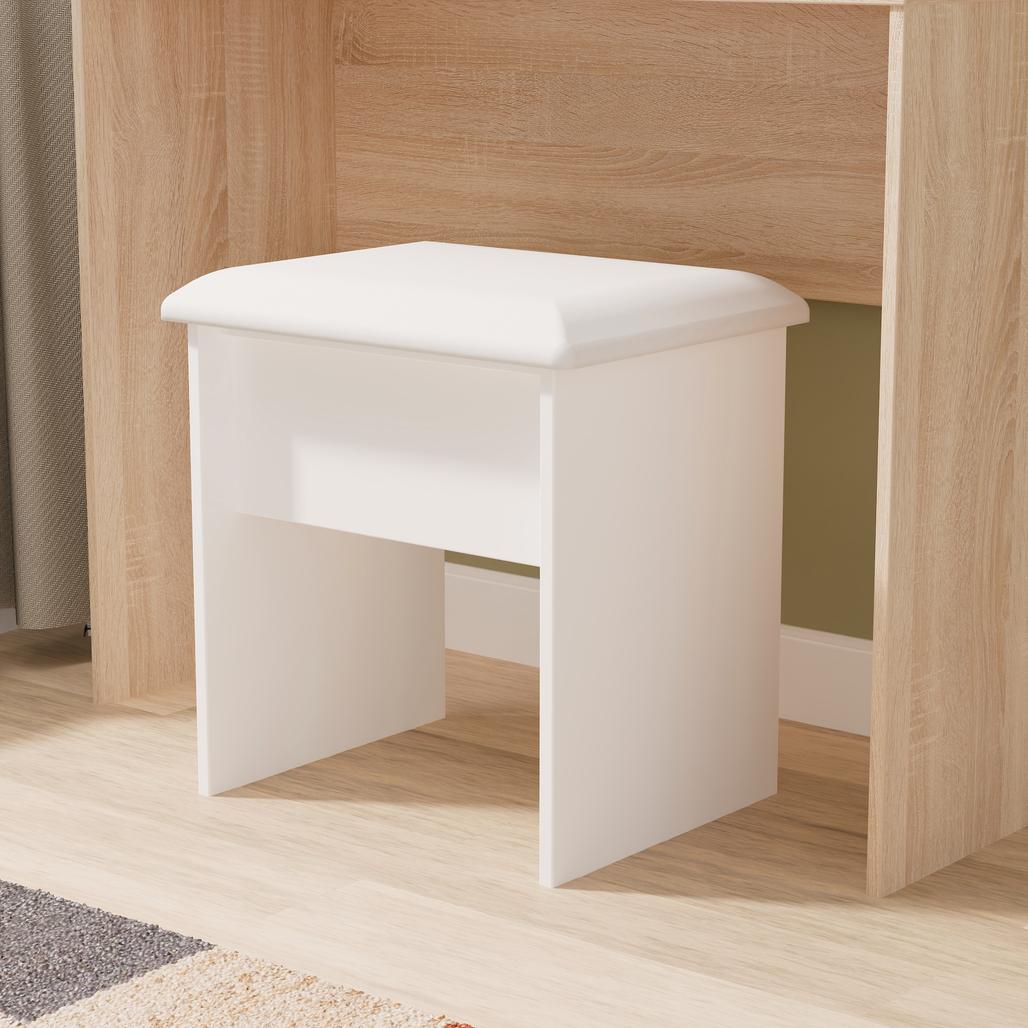 A small vanity stool. A light simple, yet sturdy design, with a soft cushioned seat. Makes an idea companion to a desk or vanity. The natural beauty of the Warwick bedroom range is complemented with curved tops and a variety of colour options. Enhanced by a delicate grooved design on all doors and drawers, with optional contrasting oak effect tops and handles this stunning bedroom range will suit any interior. All our furniture is made in the United Kingdom, to the highest quality. It is delivered direct to your location of choice by one of our two man delivery teams, and comes fully assembled (although legs may be removed to prevent damage in transit).