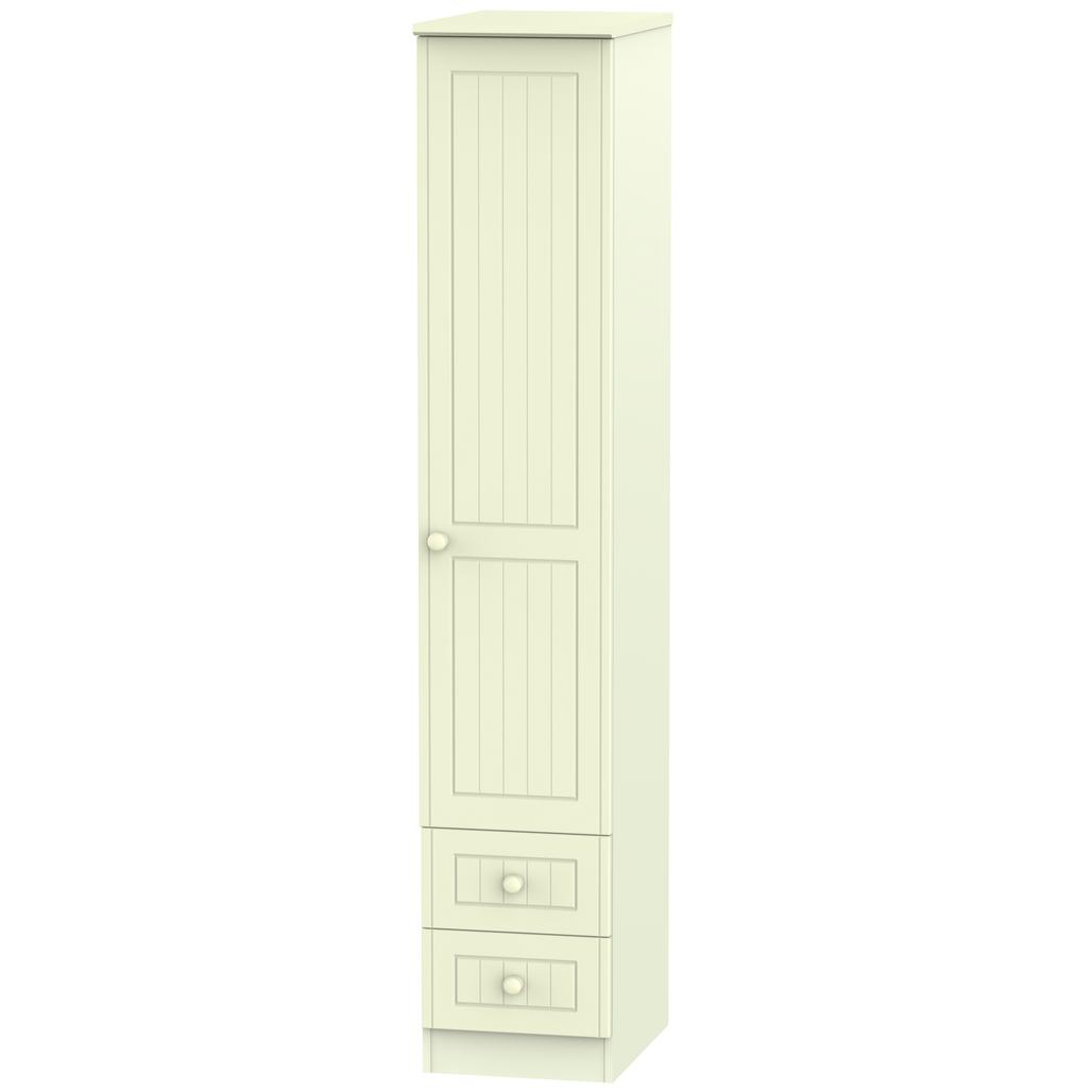 This narrow single door wardrobe is perfect for any bedroom where space is at a premium and features 2 storage drawers. . The natural beauty of the Warwick bedroom range is complemented with curved tops and a variety of colour options. Enhanced by a delicate grooved design on all doors and drawers, with optional contrasting oak effect tops and handles this stunning bedroom range will suit any interior. All our furniture is made in the United Kingdom, to the highest quality. It is delivered direct to your location of choice by one of our two man delivery teams, and comes fully assembled (although legs may be removed to prevent damage in transit).